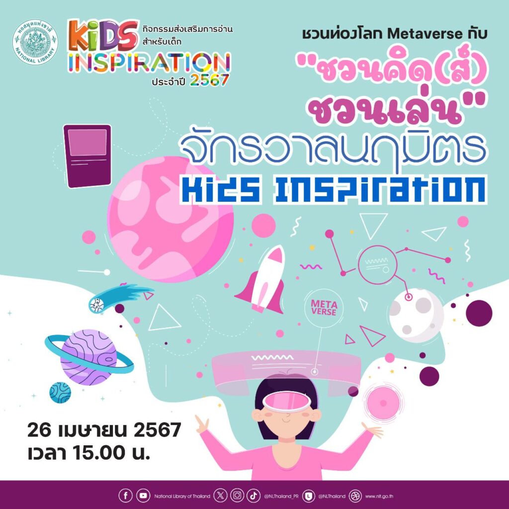 สำนักหอสมุดแห่งชาติ เชิญเข้าร่วมกิจกรรมส่งเสริมการอ่านสำหรับเด็ก Kids Inspiration ประจำปี 2567 ในหัวข้อ “ชวนคิด(ส์) ชวนเล่น” จักรวาลนฤมิตร Kids Inspiration ในวันศุกร์ที่ 26 เมษายน 2567 ตั้งแต่เวลา 15.00 น. เป็นต้นไป ณ ห้องหนังสือเด็กและเยาวชน ชั้น 2 อาคาร 1 สำนักหอสมุดแห่งชาติ