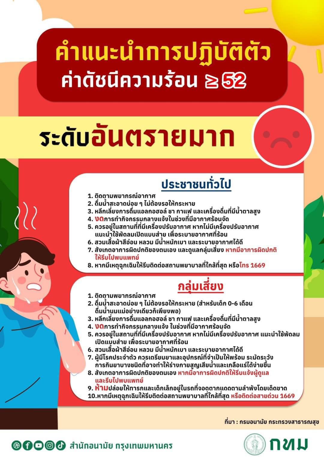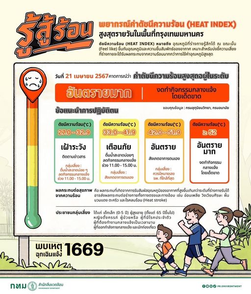 สำนักอนามัย กรุงเทพมหานคร แจ้งเตือนค่าดัชนีความร้อน (Heat Index) ประจำวันที่ 21 เมษายน 2567