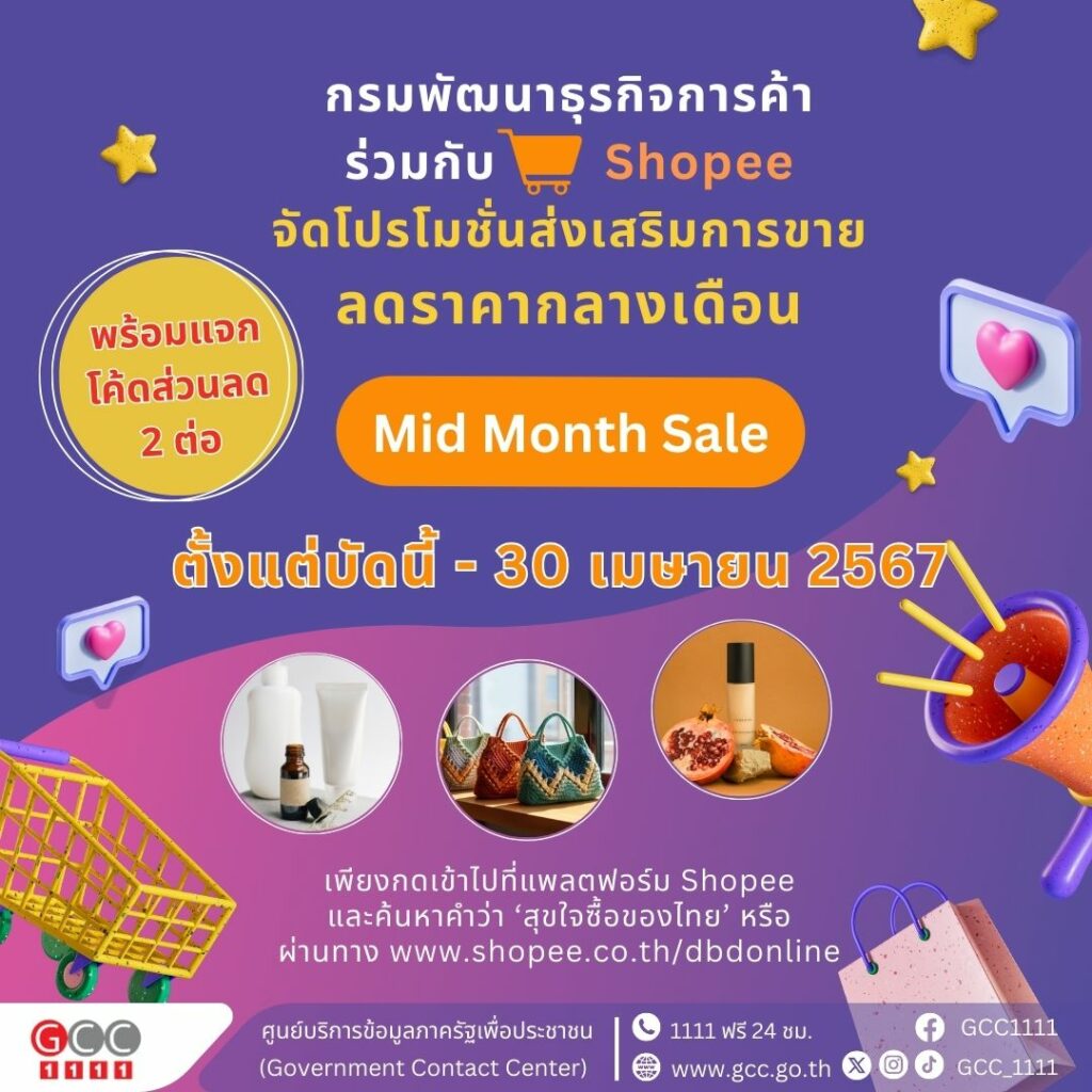 กรมพัฒนาธุรกิจการค้า ร่วมกับ ช้อปปี้ จัดโปรโมชั่นส่งเสริมการขายลดราคากลางเดือน (Mid Month Sale) คัดสินค้าเด็ด ลดฉ่ำหลังสงกรานต์ภายใต้แคมเปญ ‘สุขใจซื้อของไทย’ เพื่อให้ผู้ซื้อสามารถเลือกซื้อสินค้าคุณภาพดีในราคาที่เอื้อมถึงได้ง่ายขึ้น พร้อมมอบโค้ดส่วนลด 25% เพียงกรอก Code ‘DBD25’ ตั้งแต่วันนี้จนถึงวันที่ 30 เมษายน 2567