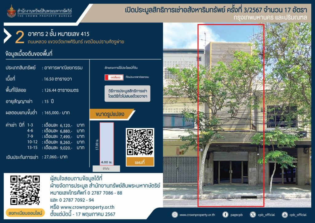 สำนักงานทรัพย์สินพระมหากษัตริย์ เปิดประมูลสิทธิการเช่าอสังหาริมทรัพย์ ครั้งที่ 3 เขตป้อมปราบศัตรูพ่าย