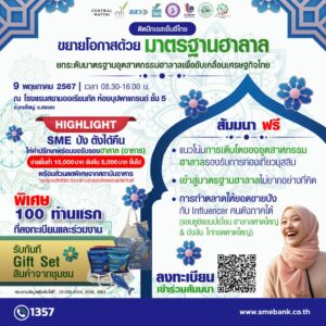 นอกจากนั้น สิทธิประโยชน์จากโครงการ “SME ปัง ตังได้คืน” (BDS) ของ สสว. สมัครเข้าร่วมและผ่านเกณฑ์พิจารณาตามเงื่อนไข ได้รับคำปรึกษา พร้อมขอรับรองฮาลาล (อาหาร) จากสถาบันอาหาร จ่ายขั้นต่ำ 10,000 บาท รับเงินคืน 5,000 บาท และจัดเต็มบริการ “เติมทุนคู่พัฒนา” จาก SME D Bank พาเข้าถึงแหล่งทุนวงเงินกู้สูงสุด 50 ล้านบาท และเสริมแกร่งธุรกิจครบวงจร ผ่านแพลตฟอร์ม “DX by SME D Bank” พิเศษ! สำหรับ 100 ท่านแรก ที่ลงทะเบียนและเข้าร่วมงาน รับฟรีทันที Premium Gift Set สนใจเข้าร่วมคลิก https://shorturl.asia/q3Xuh หรือสแกน QR Code ในโปสเตอร์ประชาสัมพันธ์ สอบถามข้อมูลเพิ่มเติมได้ที่ 02-265-4064, 4598, 4961 หรือ Call Center 1357