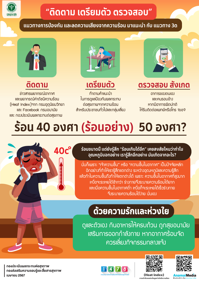 • เตรียมตัว ทำตามคำแนะนำในการดูแลป้องกันผลกระทบต่อสุขภาพจากความร้อน สำหรับประชาชนทั่วไปและกลุ่มเสี่ยง
