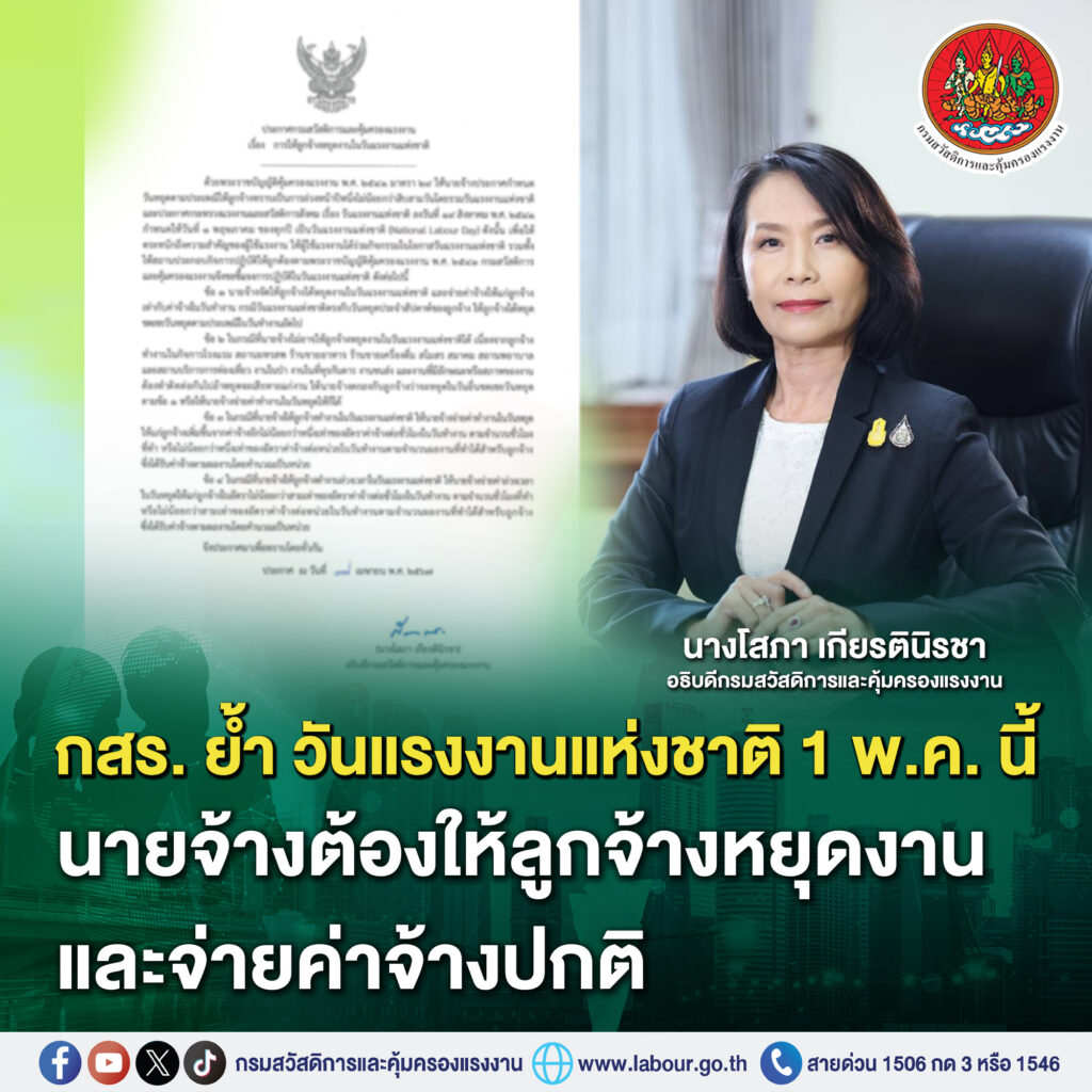 นางโสภา เกียรตินิรชา อธิบดีกรมสวัสดิการและคุ้มครองแรงงาน (กสร.) เปิดเผยว่า พระราชบัญญัติคุ้มครองแรงงาน พ.ศ. 2541 ได้กำหนดให้นายจ้างประกาศกำหนดวันหยุดตามประเพณีให้ลูกจ้างทราบเป็นการล่วงหน้าปีหนึ่งไม่น้อยกว่า 13 วันโดยรวมวันแรงงานแห่งชาติ วันที่ 1 พฤษภาคมด้วย กสร. จึงขอฝากย้ำเตือนไปยังนายจ้าง สถานประกอบกิจการให้ปฏิบัติตามกฎหมายอย่างเคร่งครัด โดยจัดให้ลูกจ้างได้หยุดงานในวันแรงงานแห่งชาติและจ่ายค่าจ้างให้แก่ลูกจ้างเท่ากับค่าจ้างในวันทำงาน กรณีที่วันแรงงานแห่งชาติตรงกับวันหยุดประจำสัปดาห์ของลูกจ้าง ให้ลูกจ้างได้หยุดชดเชยวันหยุดตามประเพณีในวันทำงานถัดไป สำหรับกรณีที่นายจ้างไม่อาจให้ลูกจ้างหยุดงานในวันดังกล่าวได้เนื่องจากลูกจ้างทำงานในกิจการโรงแรม สถานมหรสพร้านขายอาหาร ร้านขายเครื่องดื่ม สโมสร สมาคม สถานพยาบาลและสถานบริการการท่องเที่ยว งานในป่า งานในที่ทุรกันดาร งานขนส่ง และงานที่มีลักษณะงานหรือสภาพของงานต้องทำติดต่อกันไปถ้าหยุดจะเสียหายแก่งานนั้น ให้นายจ้างตกลงกับลูกจ้างว่าจะหยุดชดเชยในวันอื่นแทนหรือให้นายจ้างจ่ายค่าทำงานในวันหยุดให้ก็ได้