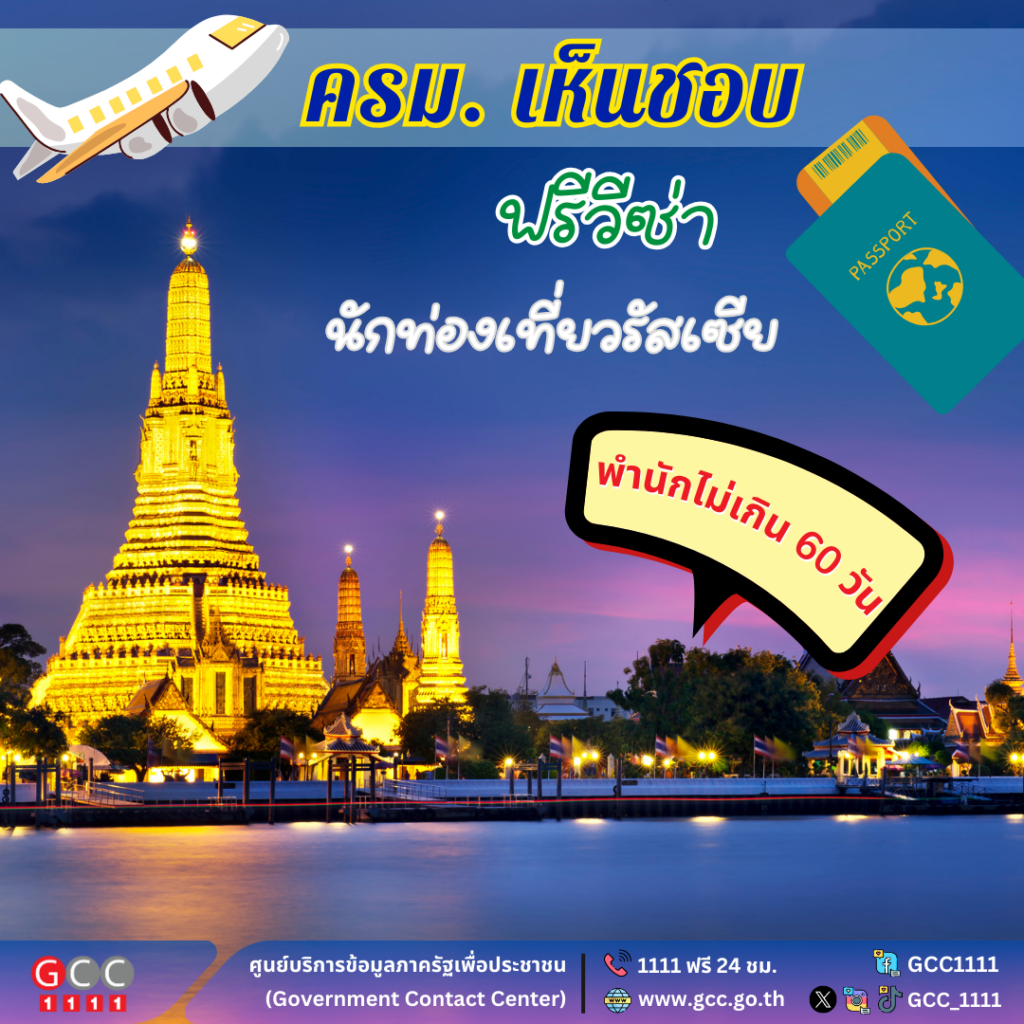 ครม.​ เห็นชอบการยกเว้นการตรวจลงตราเพื่อการท่องเที่ยวให้แก่ผู้ถือหนังสือเดินทางหรือเอกสารใช้แทนหนังสือเดินทางสัญชาติรัสเซีย เป็นกรณีพิเศษและเป็นการชั่วคราว​ พำนักได้ถึง​ 60​ วัน​