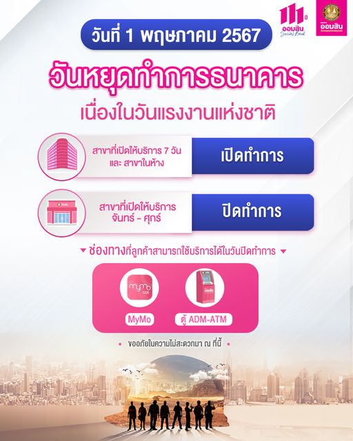 ธนาคารออมสิน แจ้งวันหยุดทำการ วันที่ 1 พฤษภาคม 2567