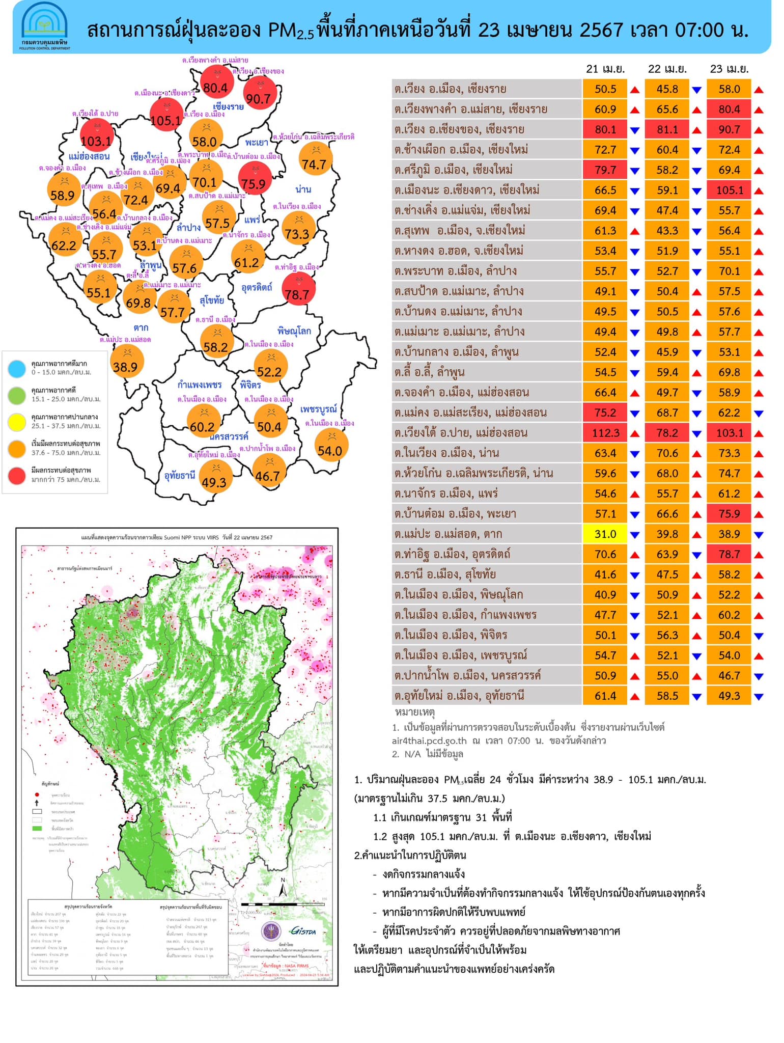 - สำหรับประชาชนที่อยู่บริเวณพื้นที่มีผลกระทบต่อสุขภาพ (พื้นที่สีแดง) ควรหลีกเลี่ยงกิจกรรมกลางแจ้ง หรือใช้อุปกรณ์ป้องกันตนเอง หากมีอาการทางสุขภาพควรปรึกษาแพทย์