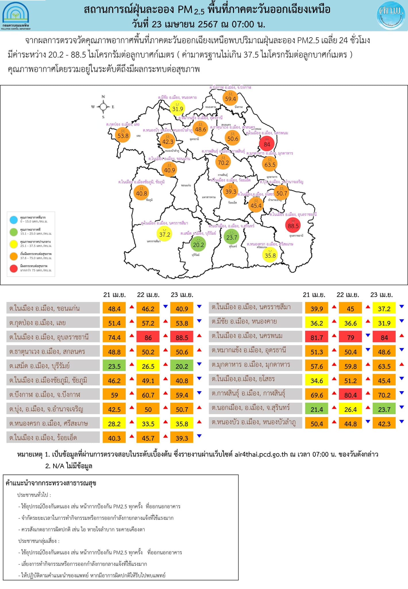 - ภาคตะวันออกเฉียงเหนือ เกินค่ามาตรฐานเป็นส่วนใหญ่ ตรวจวัดได้ 20.2 – 88.5 ไมโครกรัมต่อลูกบาศก์เมตร