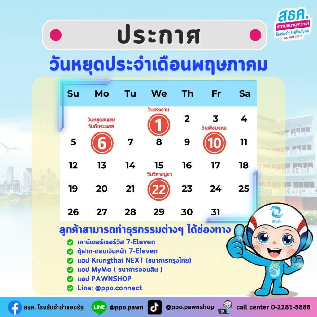 สถานธนานุเคราะห์ โรงรับจำนำของรัฐ ประกาศวันหยุดประจำเดือนพฤษภาคม 2567