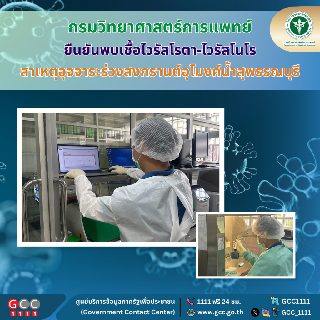 กรมวิทยาศาสตร์การแพทย์ ยืนยันพบเชื้อไวรัสโรตาและไวรัสโนโร สาเหตุอุจจาระร่วงสงกรานต์อุโมงค์น้ำสุพรรณบุรี เตรียมทดสอบสายพันธุ์เพื่อสนับสนุนการพัฒนาวัคซีนและควบคุมการระบาด