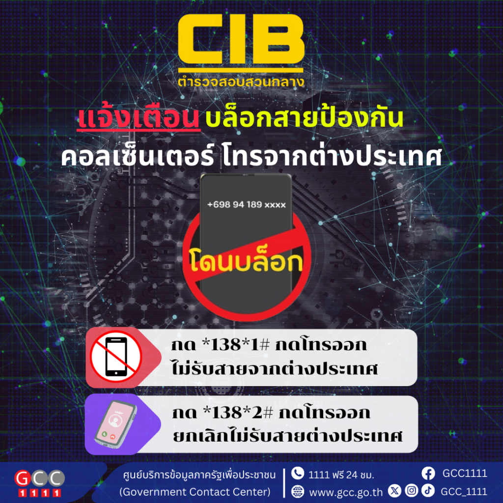 กองบัญชาการตำรวจสอบสวนกลาง แจ้งเตือนบล็อกสายป้องกันคอลเซ็นเตอร์ โทรจากต่างประเทศ กด *138*1#