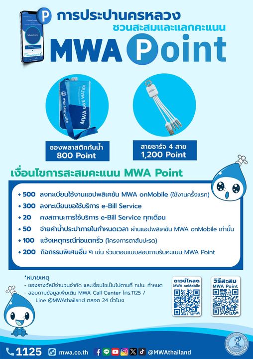 การประปานครหลวง ชวนแลกคะแนน MWA Point รับของรางวัลใหม่ เริ่มตั้งแต่บัดนี้ (24 เมษายน 2567)