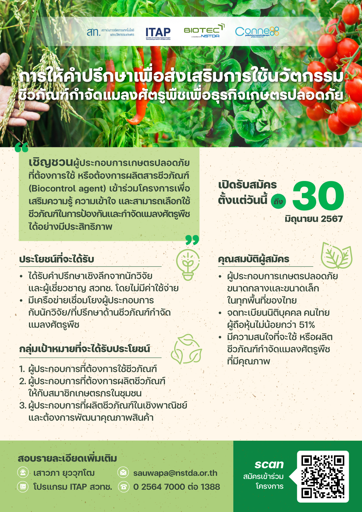 เชิญชวนผู้ประกอบการเกษตรปลอดภัย ที่ต้องการใช้ หรือต้องการผลิตสารชีวภัณฑ์ (Biocontrol agent) เข้าร่วมโครงการเพื่อ เสริมความรู้ ความเข้าใจ และสามารถเลือกใช้ ชีวภัณฑ์ในการป้องกันและกําจัดแมลงศัตรูพืชได้อย่างมีประสิทธิภาพ