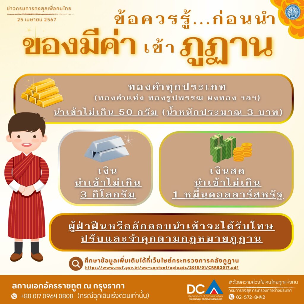 กรมการกงสุล แนะนำ ข้อควรรู้ ก่อนนำของมีค่าเข้าภูฏาน ดังนี้ 1) ทองคำทุกประเภท (ทองคำแท่ง ทองรูปพรรณ ผงทอง ฯลฯ) นำเข้าไม่เกิน 50 กรัม (น้ำหนักประมาณ 3 บาท) 2) เงิน นำเข้าไม่เกิน 3 กิโลกรัม 3) เงินสด นำเข้าไม่เกิน 1 หมื่นดอลลาร์สหรัฐ ทั้งนี้ ผู้ฝ่าฝืนหรือลักลอบนำเข้าจะได้รับโทษปรับ และจำคุกตามกฎหมายภูฏาน ศึกษาข้อมูลเพิ่มเติมได้ที่ เว็บไซต์กระทรวงการคลังภูฏาน https://www.mof.gov.bt/wp…/uploads/2018/01/CRRB2017.pdf สถานเอกอัครราชทูต ณ กรุงธากา โทร. +88 0170964 0808 (กรณีฉุกเฉินเร่งด่วนเท่านั้น)