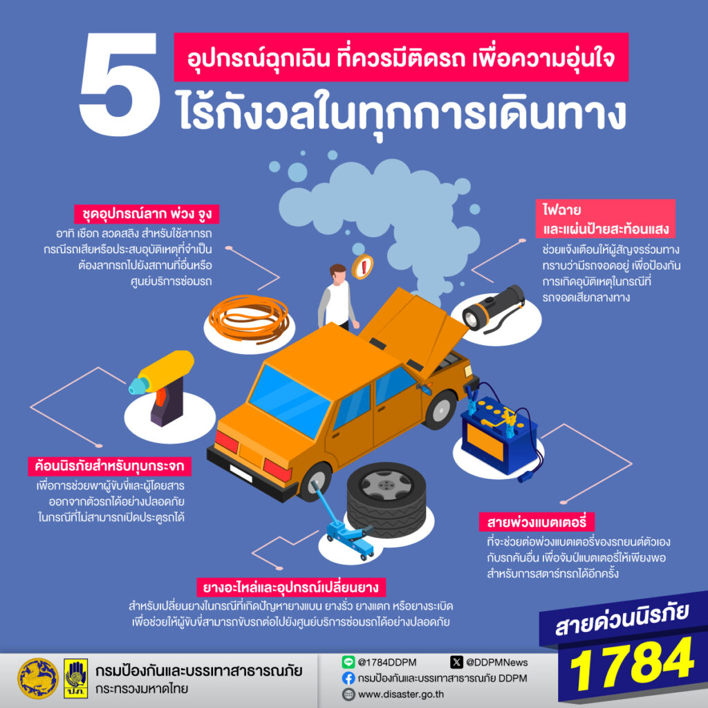 กรมป้องกันและบรรเทาสาธารณภัย แนะนำ 5 อุปกรณ์ฉุกเฉินที่ควรมีติดรถ เพื่อความอุ่นใจไร้กังวลในทุกการเดินทาง