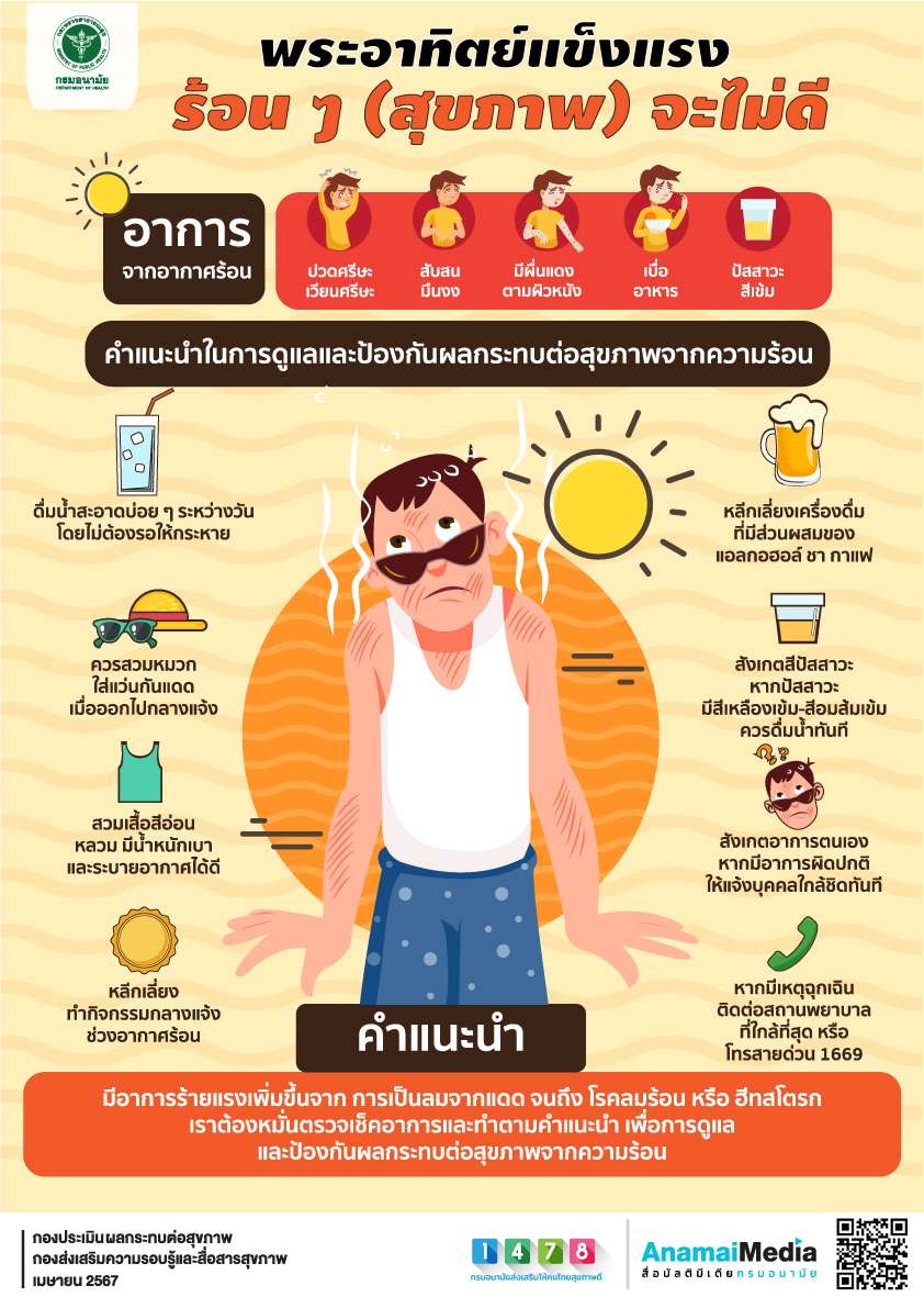 พระอาทิตย์แข็งแรง ร้อน ๆ (สุขภาพ) จะไม่ดี ฤดูร้อนปีนี้ พุ่งทะยานกว่าทุกปี อาจแตะ 50 องศาเซลเซียส เลยทีเดียว และในสภาพอากาศที่ร้อนจัดแบบนี้ ต้องสังเกตอาการเสี่ยงเหล่านี้ เช่น ปวดศรีษะ เวียนศรีษะ สับสน มึนงง มีผื่นแดงตามผิวหนัง เบื่ออาหาร หรือ ปัสสาวะสีเข้ม เพื่อเฝ้าระวัง กรมอนามัย จึงมีคำแนะนำในการดูแลและป้องกันผลกระทบต่อสุขภาพจากความร้อน แบ่งออกเป็น 2 กลุ่ม