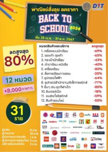 กระทรวงพาณิชย์ จัดโครงการพาณิชย์สั่งลุย ลดราคา “Back To School 2024” สูงสุดถึง 80% อาทิ เครื่องแบบนักเรียน เครื่องเขียน อุปกรณ์การเรียน และตำราเรียน เป็นต้น เริ่มตั้งแต่วันที่ 25 เมษายน – 31 พฤษภาคม 2567