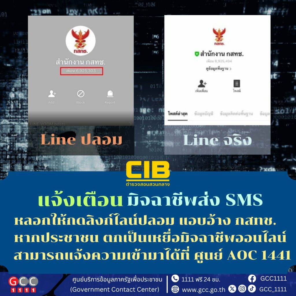 กองบัญชาการตำรวจสอบสวนกลาง แจ้งเตือนขณะนี้มีมิจฉาชีพส่ง SMS หลอกให้กดลิงก์แอดไลน์ปลอม แอบอ้างเป็นสำนักงาน กสทช. เพื่อลงทะเบียนยืนยันตัวตนการถือครองซิมการ์ดก่อนถูกระงับสัญญาณ ทาง กสทช. ไม่มีนโยบายรับลงทะเบียนซิมเพื่อยืนยันตัวตนทุกช่องทาง หากได้รับ SMS ดังกล่าว อย่าหลงเชื่อกดลิงก์ที่แนบมากับ SMS ตรวจสอบไปยังหน่วยงานที่เกี่ยวข้องก่อนทุกครั้ง เพื่อป้องกันตกเป็นเหยื่อของมิจฉาชีพ