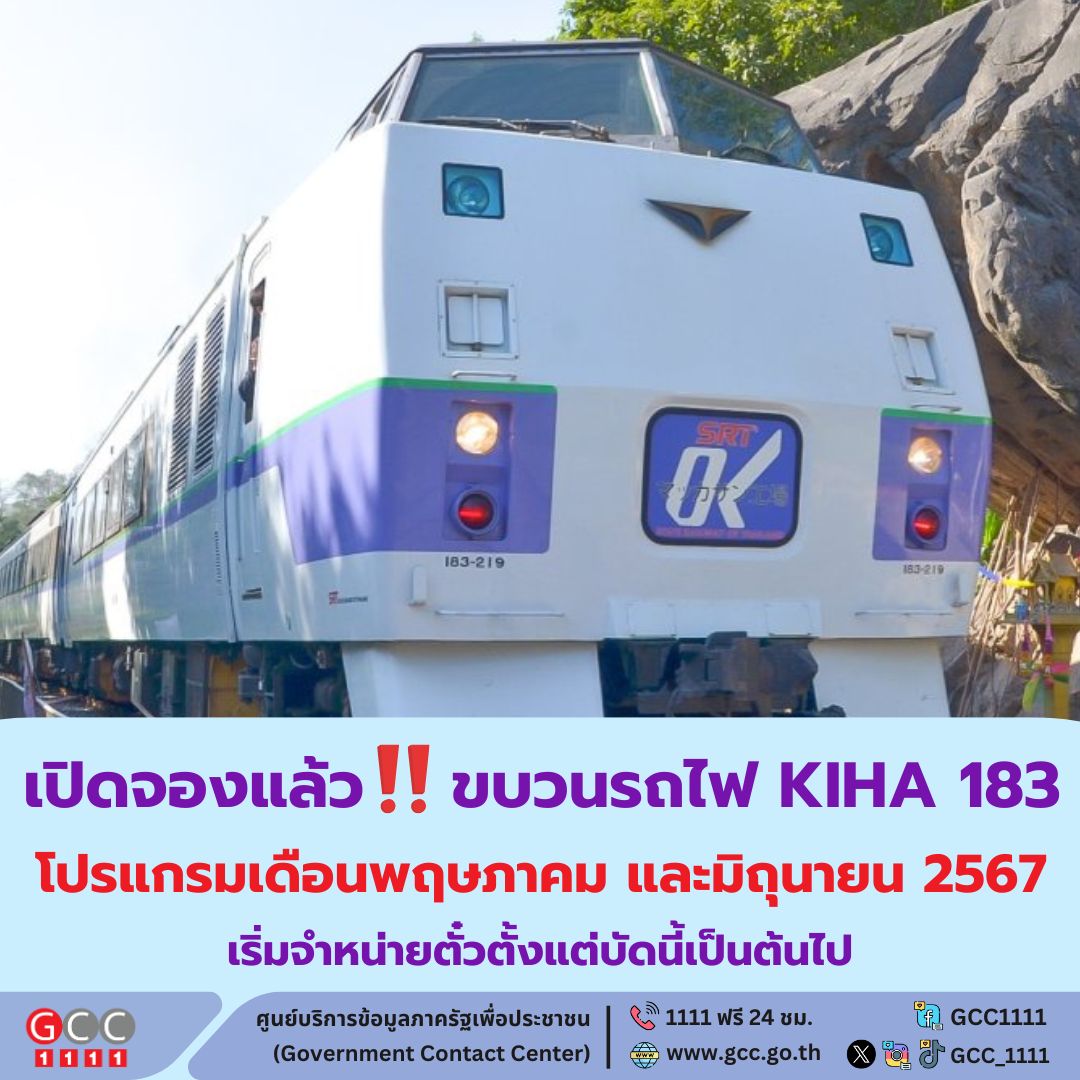 การรถไฟแห่งประเทศไทย เชิญชวนท่องเที่ยวทริปพิเศษกับขบวนรถไฟ KIHA 183 ประจำเดือนพฤษภาคม และมิถุนายน 2567 ภายใต้คอนเซ็ปต์ ท่องไปตามสายลมในเดือนพฤษภาคม และฟ้าใส ป่าโปร่ง พฤกษานานาพรรณในเดือนมิถุนายน โดยจัดรวม 14 ทริป 9 เส้นทาง ทั้งแบบไปเช้ากลับเย็น หรือแบบพักค้างคืน ทุกวันเสาร์และอาทิตย์ เริ่มจำหน่ายตั๋วโดยสารตั้งแต่บัดนี้เป็นต้นไป จำกัดจำนวน 202 ที่นั่งต่อทริปเท่านั้น
