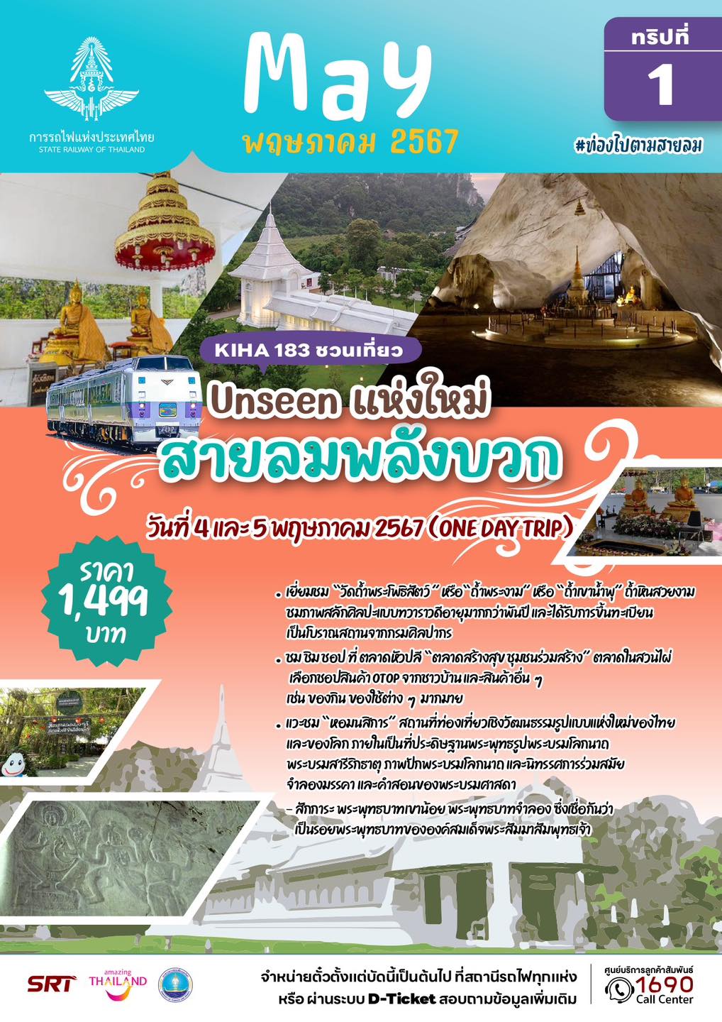 – ทริปที่ 1 และ 2 แบบไปเช้าเย็นกลับ (วันที่ 4 และ 5 พฤษภาคม 67) โปรแกรม Unseen แห่งใหม่ สายลมพลังบวก จังหวัดสระบุรี พาเที่ยววัดถ้ำพระโพธิสัตว์ ตลาดสร้างสุข ชุมชนร่วมสร้าง สักการะพระพุทธบาทเขาน้อย หอนมสิการ สถานที่ท่องเที่ยวเชิงวัฒนธรรม Unseen แห่งใหม่ของไทย คนละ 1,499 บาท