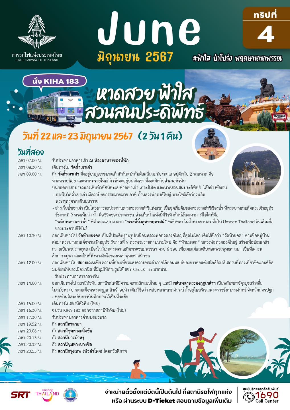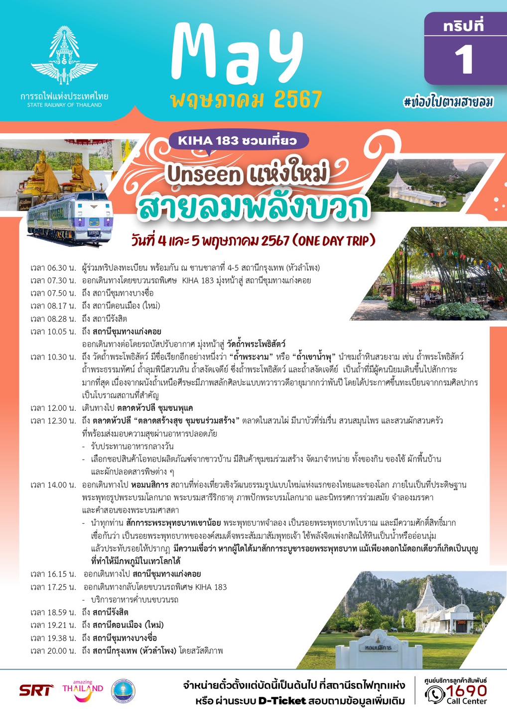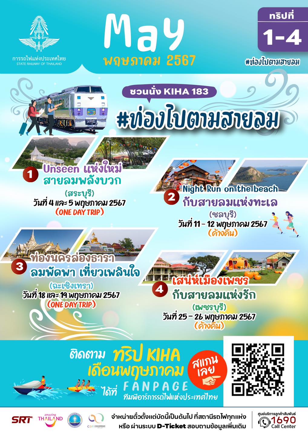 นายเอกรัช ศรีอาระยันพงษ์ หัวหน้าสำนักงานผู้ว่าการ การรถไฟแห่งประเทศไทย เปิดเผยว่า ในเดือนพฤษภาคม – มิถุนายน 2567 การรถไฟฯ ขอเชิญชวนท่องเที่ยวทริปพิเศษ กับขบวนรถไฟ KIHA 183 ภายใต้คอนเซ็ปท่องไปตามสายลมในเดือนพฤษภาคม และฟ้าใส ป่าโปร่ง พฤกษานานาพรรณในเดือนมิถุนายน รวม 14 ทริป 9 เส้นทาง โดยพาทุกท่านร่วมเดินทางไปในเส้นทาสายต่างๆ หลายรูปแบบ ตอบโจทย์ทุกไลฟ์สไตล์ ทั้งสายมู สายธรรมชาติ และสายชอป ชิม ชิว ทั้งแบบไปเช้ากลับเย็น หรือแบบพักค้างคืน ทุกวันเสาร์และอาทิตย์ ตลอด 2 เดือนเต็ม