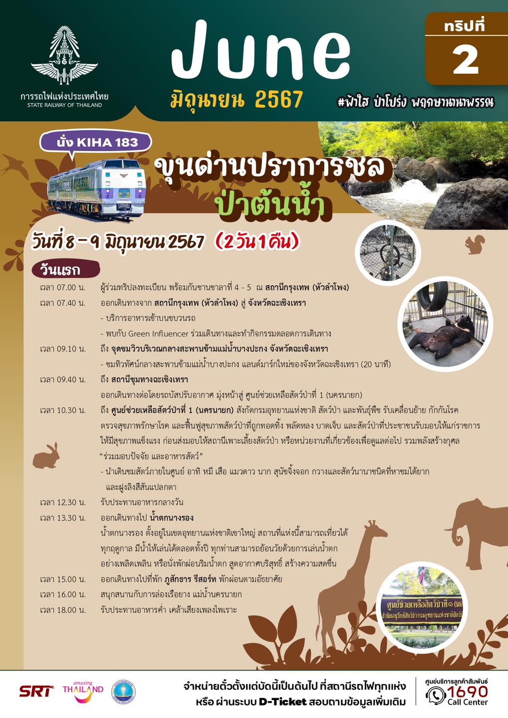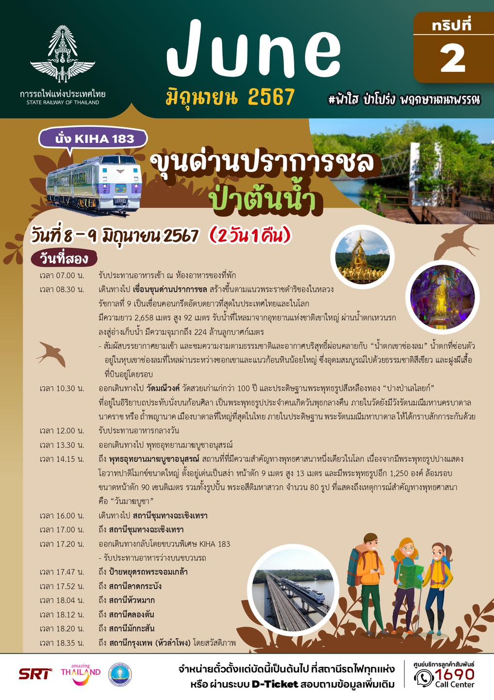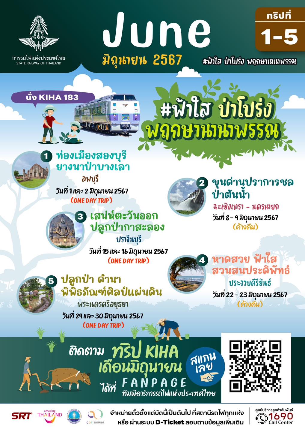 นายเอกรัช ศรีอาระยันพงษ์ หัวหน้าสำนักงานผู้ว่าการ การรถไฟแห่งประเทศไทย เปิดเผยว่า ในเดือนพฤษภาคม – มิถุนายน 2567 การรถไฟฯ ขอเชิญชวนท่องเที่ยวทริปพิเศษ กับขบวนรถไฟ KIHA 183 ภายใต้คอนเซ็ปท่องไปตามสายลมในเดือนพฤษภาคม และฟ้าใส ป่าโปร่ง พฤกษานานาพรรณในเดือนมิถุนายน รวม 14 ทริป 9 เส้นทาง โดยพาทุกท่านร่วมเดินทางไปในเส้นทาสายต่างๆ หลายรูปแบบ ตอบโจทย์ทุกไลฟ์สไตล์ ทั้งสายมู สายธรรมชาติ และสายชอป ชิม ชิว ทั้งแบบไปเช้ากลับเย็น หรือแบบพักค้างคืน ทุกวันเสาร์และอาทิตย์ ตลอด 2 เดือนเต็ม