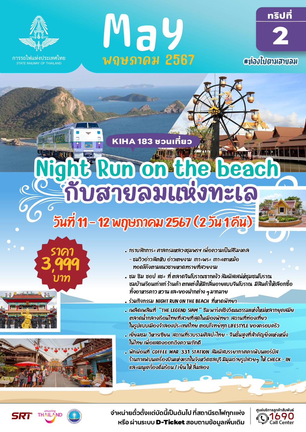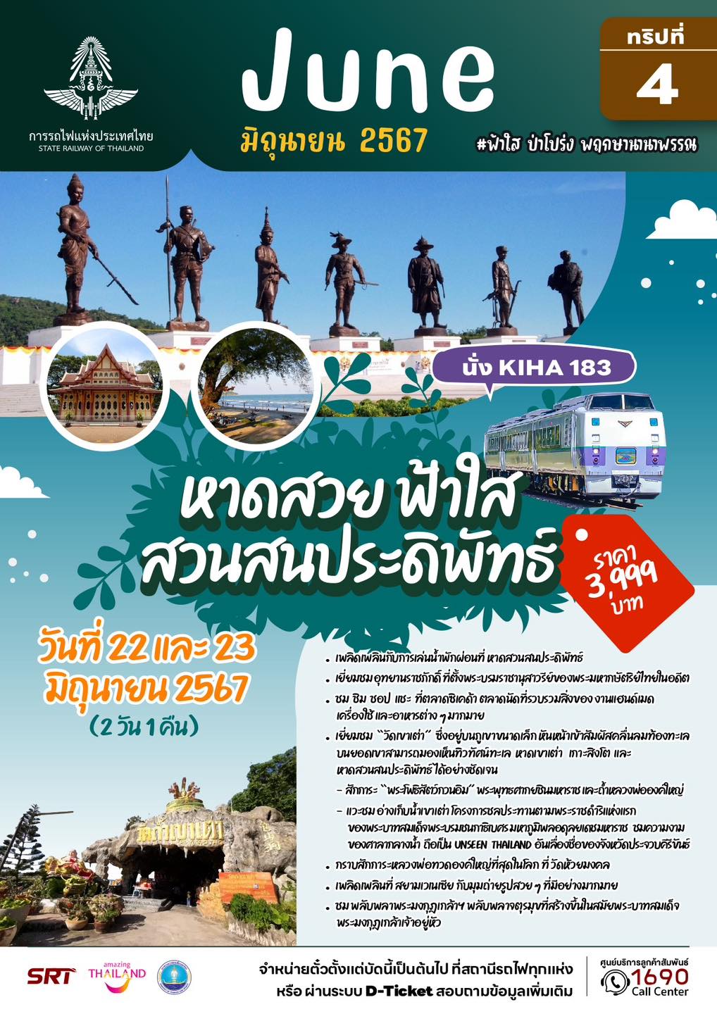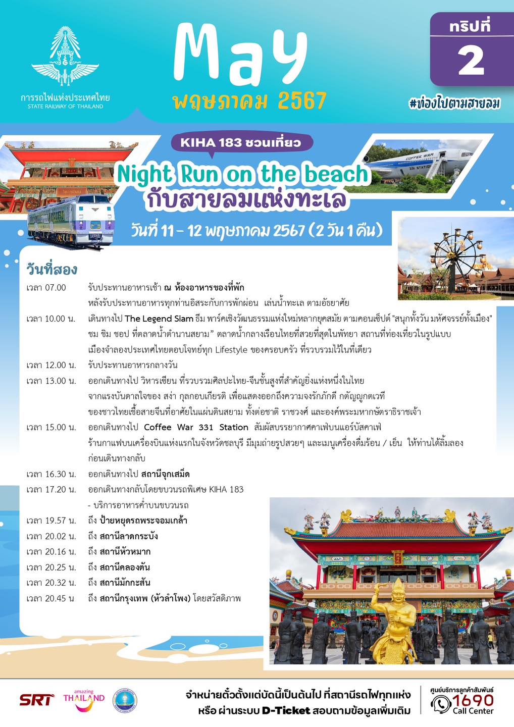 ทั้งนี้ นักท่องเที่ยวที่สนใจ สามารถสำรองที่นั่งได้ตั้งแต่วันที่ 22 เมษายน 2567 เวลา 08.30 น. เป็นต้นไป จำกัดจำนวน 202 ที่นั่งต่อทริปเท่านั้น ซึ่งราคาดังกล่าวเป็นราคารวมค่าโดยสารรถไฟ ค่ารถบัสปรับอากาศ ค่าเข้าชมสถานที่ต่างๆ พร้อมอาหารและเครื่องดื่มแบบจัดเต็มตลอดการเดินทาง รวมทั้ง ค่าประกันอุบัติเหตุ โดยจองตั๋วได้ที่สถานีรถไฟทุกแห่งทั่วประเทศ และช่องทางการจำหน่ายตั๋วระบบออนไลน์ D – Ticket ของการรถไฟฯ สอบถามข้อมูลเพิ่มเติมได้ที่ศูนย์บริการลูกค้าสัมพันธ์ 1690 ตลอด 24 ชั่วโมง