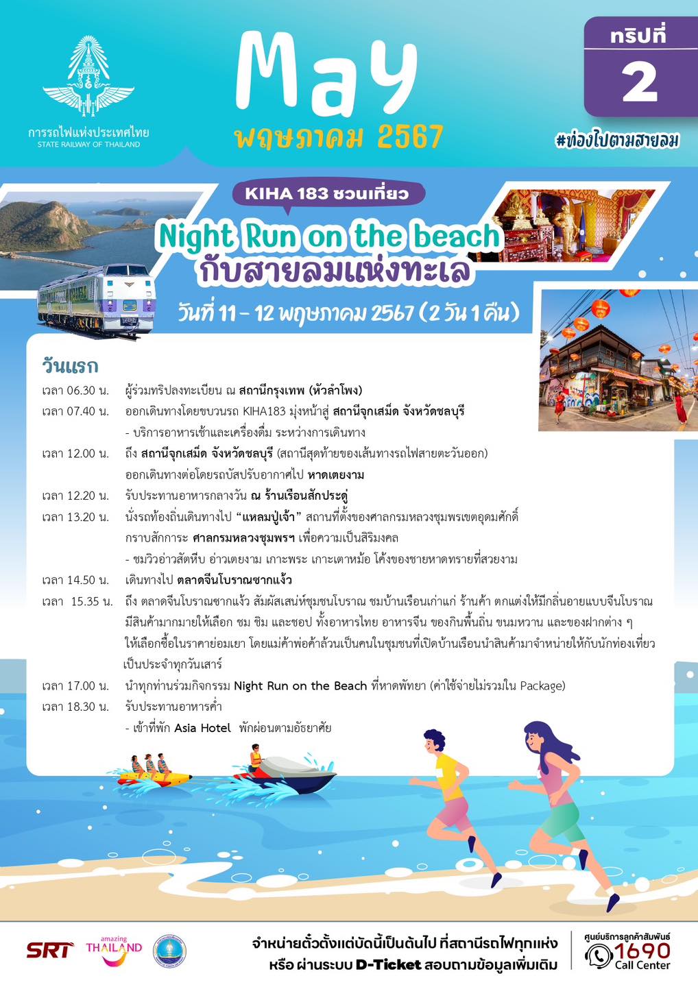 – ทริปที่ 3 แบบค้างคืน (วันที่ 11 – 12 พฤษภาคม 67) โปรแกรม Night Run on the beach กับสายลมแห่งทะเล จังหวัดชลบุรี พาไปเล่นน้ำทะเล เกาะติดกิจกรรม Night Run On The Beach (Doraemon Run) พาเล่นน้ำทะเลให้ชุ่มฉ่ำใจ คนละ 3,999 บาท