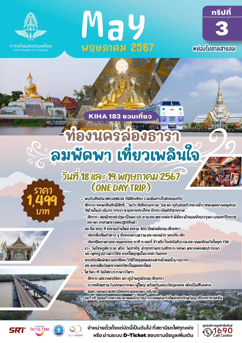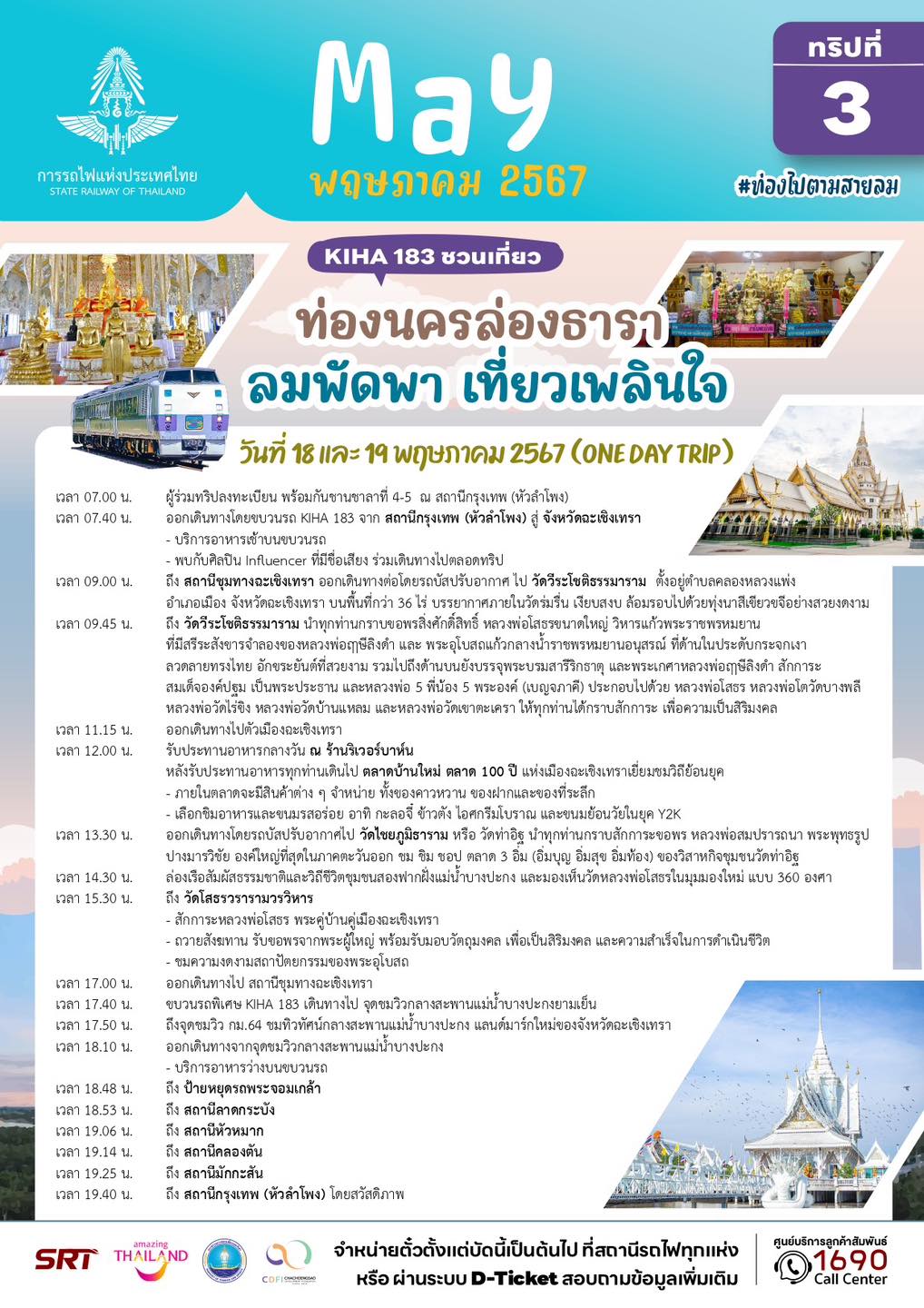 – ทริปที่ 4 และ 5 แบบไปเช้าเย็นกลับ (วันที่ 18 และ 19 พฤษภาคม 67) โปรแกรม ท่องนครล่องธารา ลมพัดพา เที่ยวเพลินใจ จังหวัดฉะเชิงเทรา พาล่องเรือชมวิถีชีวิตชุมชนสองฟากฝั่งแม่น้ำบางปะกง ขอพรสิ่งศักดิ์สิทธิ์ วัดวีระโชติธรรมาราม ชมพระอุโบสถแก้วกลางน้ำราชพรหมยานอนุสรณ์ คนละ 1,499 บาท