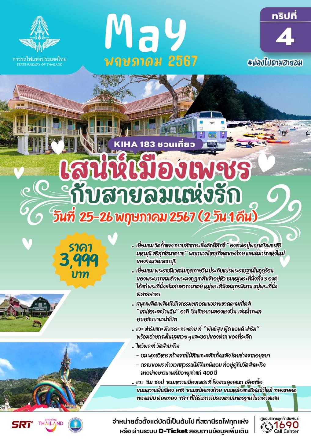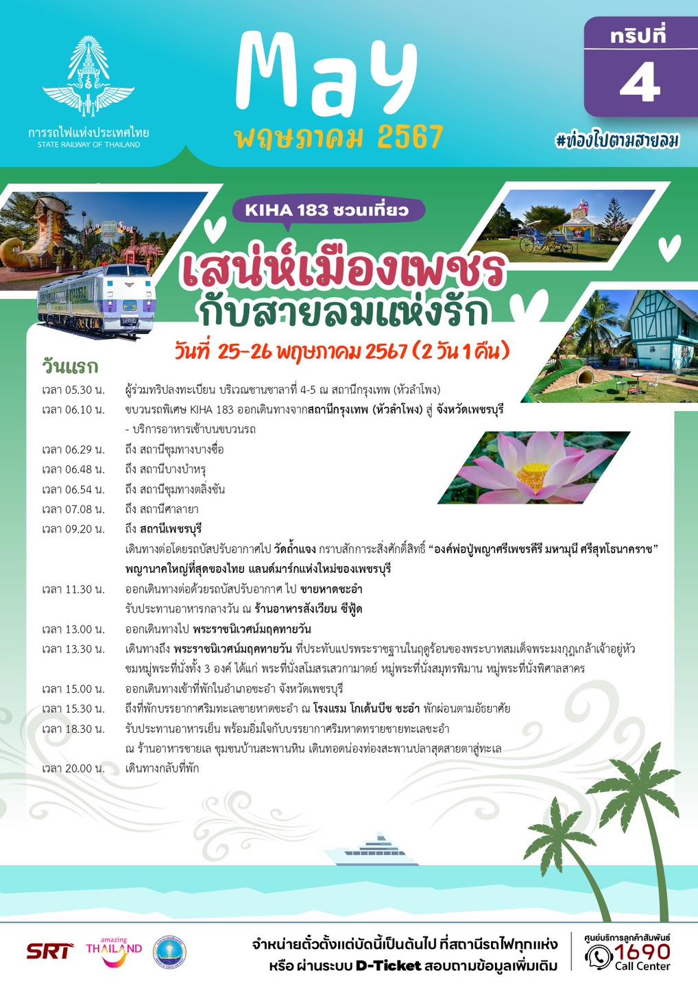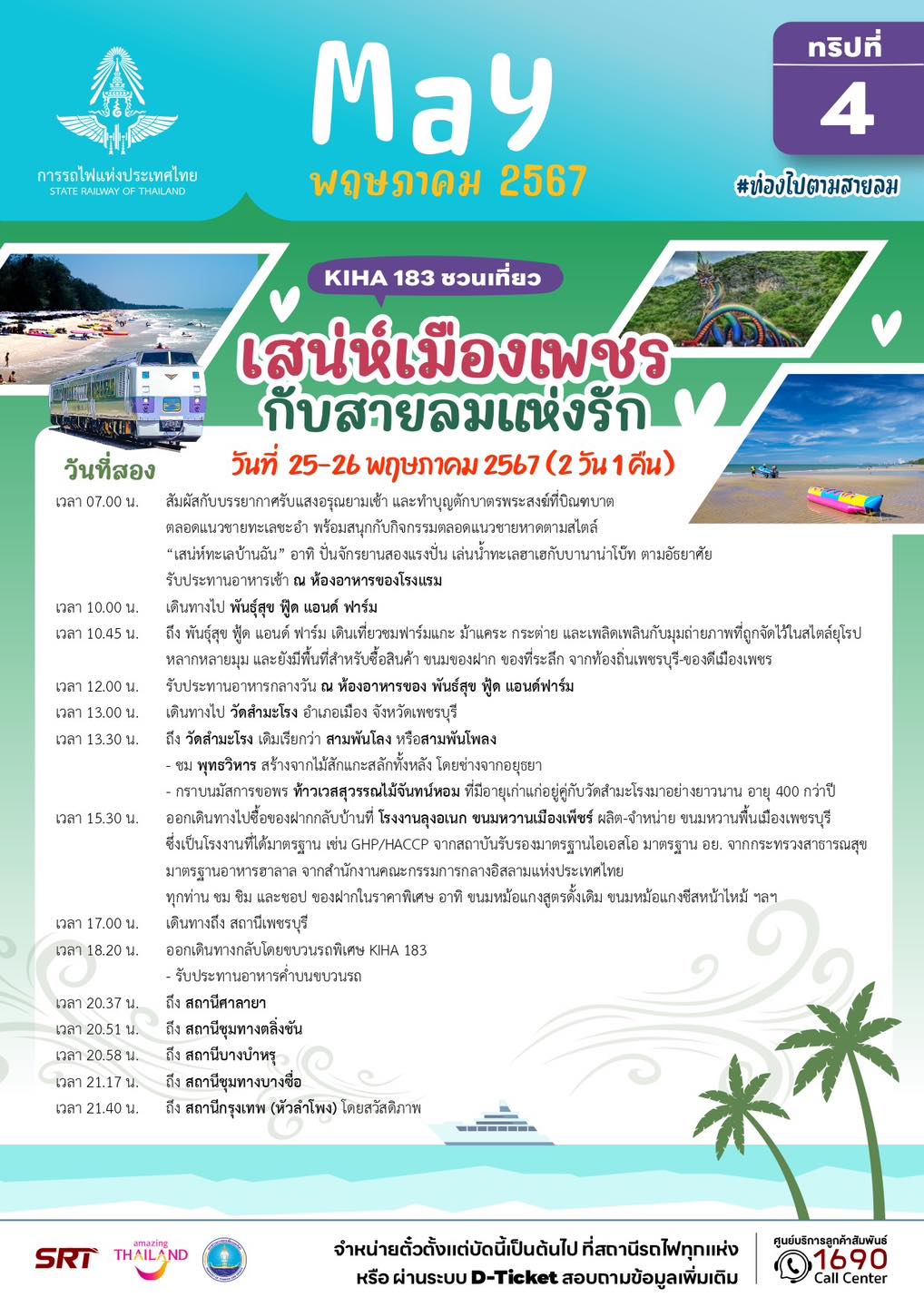 – ทริปที่ 6 แบบค้างคืน (วันที่ 25 – 26 พฤษภาคม 67) โปรแกรม เสน่ห์เมืองเพชร กับสายลมแห่งรัก จังหวัดเพชรบุรี พาชมพระราชนิเวศน์มฤคทายวัน สักการะองค์พ่อปู่พญาศรีเพชรคีรี มหามุนี ศรีสุทโธนาคราช สนุกกับกิจกรรม “เสน่ห์ทะเลบ้านฉัน” ปั่นจักรยานสองแรงปั่น เล่นน้ำทะเล ฮาเฮกับบานาน่าโบ๊ท คนละ 3,999 บาท
