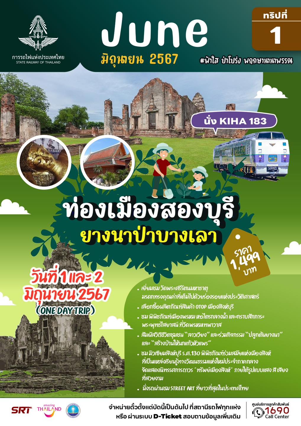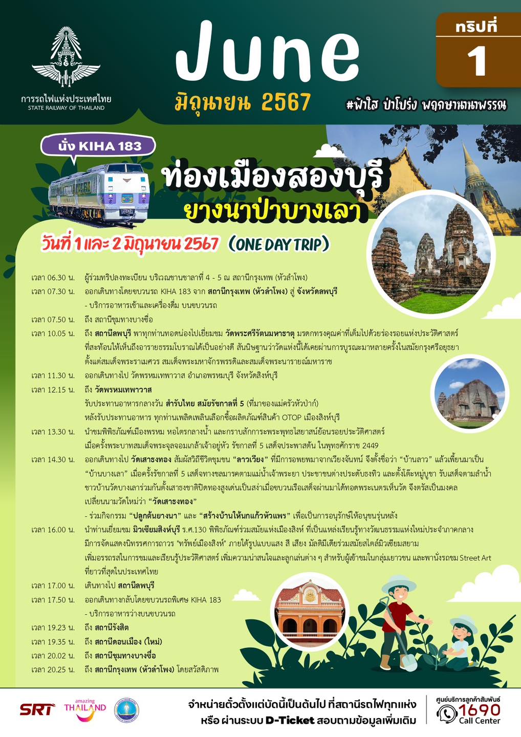 – ทริปที่ 7 และ 8 แบบไปเช้าเย็นกลับ (วันที่ 1 และวันที่ 2 มิถุนายน 67) โปรแกรม ท่องเมืองสองบุรี ยางนาป่าบางเลา จังหวัดลพบุรี ชวนปลูกต้นยางนา สร้างบ้านให้นกแก้วหัวแพร สัมผัสวิถีชุมชน “ลาวเวียง” และพิพิธภัณฑ์ร่วมสมัยแห่งเมืองสิงห์บุรี คนละ 1,499 บาท