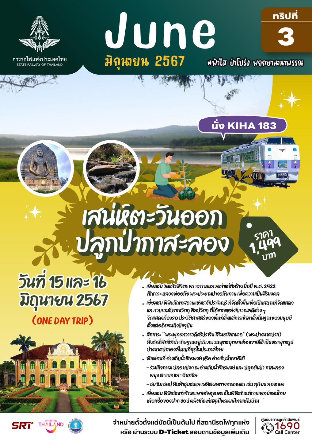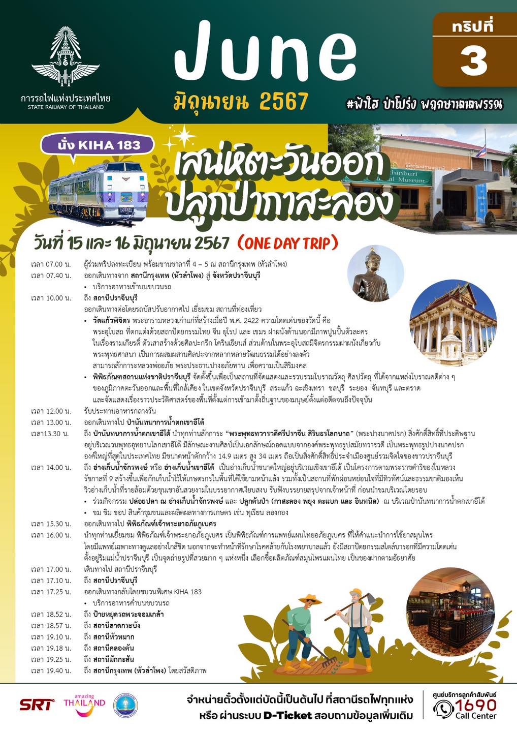 – ทริปที่ 10 และ 11 แบบไปเช้าเย็นกลับ (วันที่ 15 และ 16 มิถุนายน 67) โปรแกรม เสน่ห์ตะวันออก ปลูกป่ากาสะลอง จังหวัดปราจีนบุรี พาเที่ยววัดแก้วพิจิตร พิพิธภัณฑ์สถานแห่งชาติปราจีนบุรี สักการะสิ่งศักดิ์สิทธิ์ วนอุทยานเขาอีโต้ ร่วมกิจกรรมปล่อยปลา ปลูกป่ากาสะลอง ชิม ชอป สินค้าชุมชนและผลิตผลทางการเกษตร คนละ 1,499 บาท