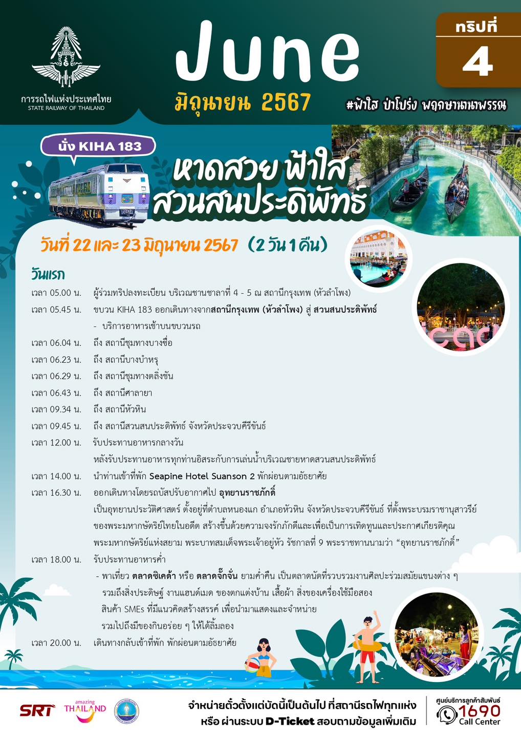 – ทริปที่ 12 แบบค้างคืน (วันที่ 22 – 23 มิถุนายน 67) โปรแกรม หาดสวย ฟ้าใส สวนสนประดิพัทธ์ จังหวัดประจวบคีรีขันธ์ พาไปเล่นน้ำทะเลที่หาดสวนสนประดิพัทธ์ เที่ยวชมอุทยานราชภักดิ์ วัดห้วยมงคล อ่างเก็บน้ำเขาเต่า โครงการชลประทานตามรอยพระราชดำริแห่งแรกของในหลวงรัชกาลที่ 9 พาเที่ยวตลาดชิกกาด้า และเมืองหัวหิน คนละ 3,999 บาท