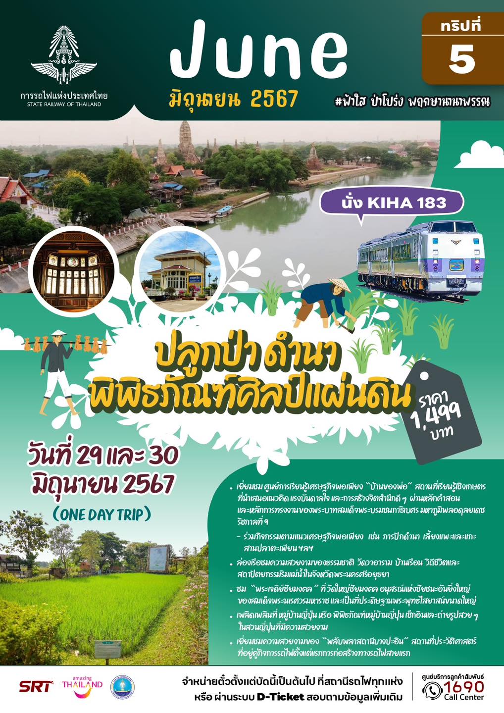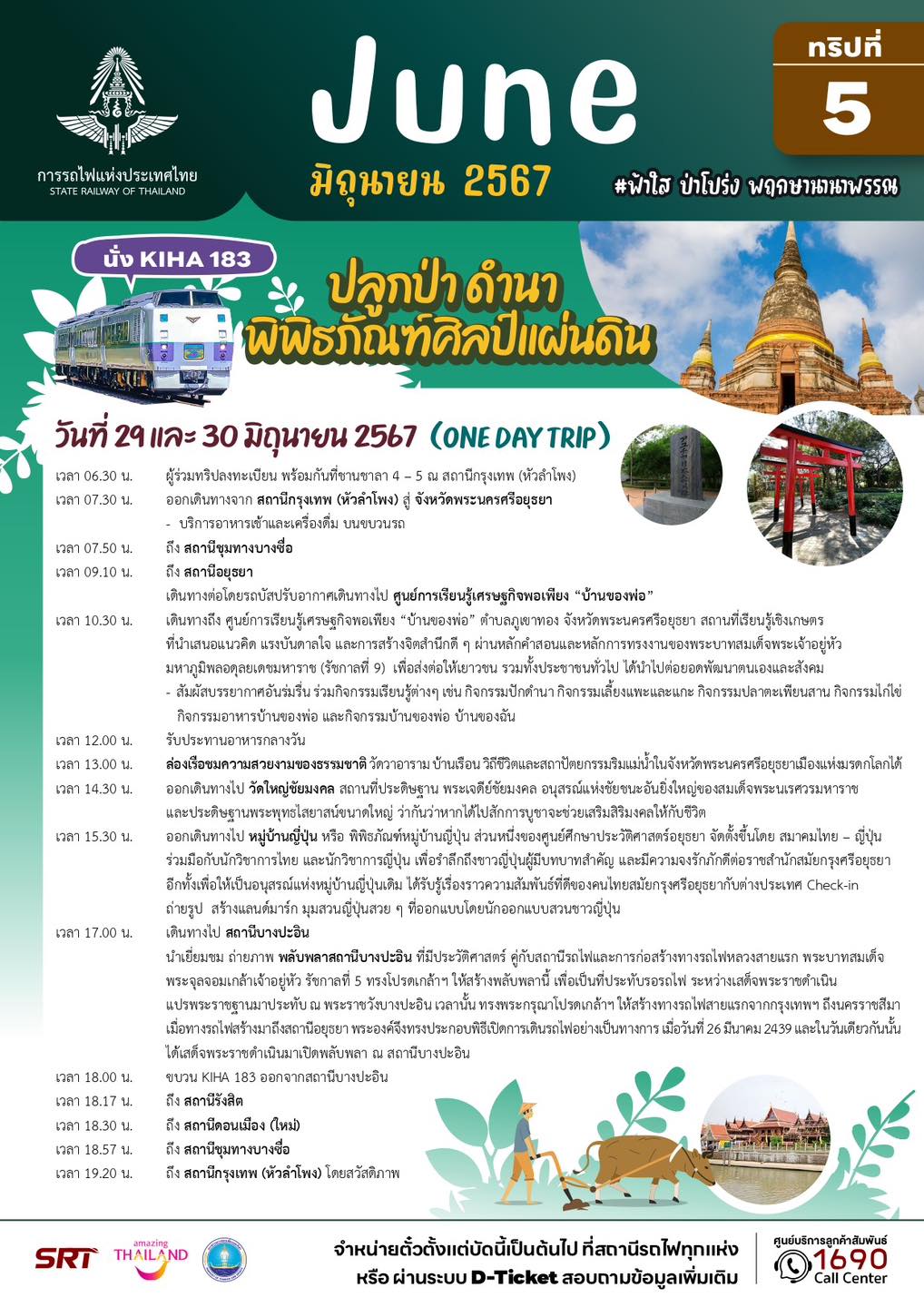 – ทริปที่ 13 และ 14 แบบไปเช้าเย็นกลับ (วันที่ 29 และ 30 มิถุนายน 67) โปรแกรม ปลูกป่า ดำนา พิพิธภัณฑ์ศิลป์แผ่นดิน จังหวัดพระนครศรีอยุธยา พาชมศูนย์การเรียนรู้เศรษฐกิจพอเพียง “บ้านของพ่อ” ล่องเรือชมความงามสองฟากฝั่งแม่น้ำเจ้าพระยา ชมวัดใหญ่ชัยมงคล ชวนกัน check-in ที่หมู่บ้านญี่ปุ่น คนละ 1,499 บาท