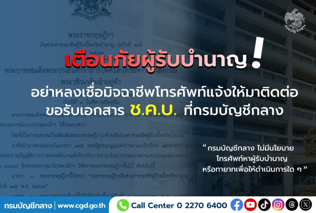 • “กรมบัญชีกลางไม่มีนโยบายโทรศัพท์ไปหาผู้รับบำนาญหรือทายาทเพื่อให้มาติดต่อขอรับเอกสารหรือดำเนินการใดๆ ที่กรมบัญชีกลาง”