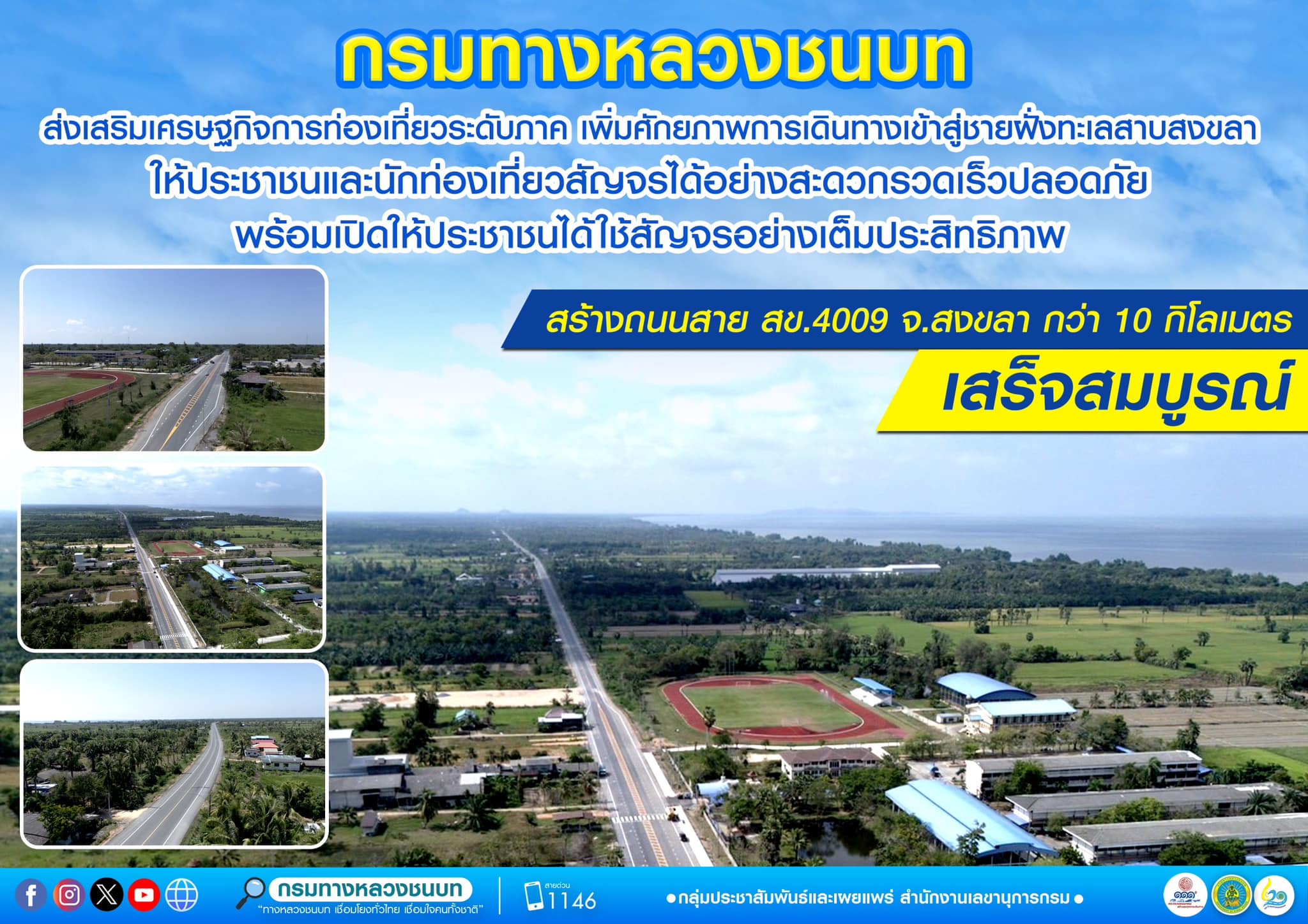 กรมทางหลวงชนบท ส่งเสริมเศรษฐกิจการท่องเที่ยวระดับภาค เพิ่มศักยภาพการเดินทางเข้าสู่ชายฝั่งทะเลสาบสงขลาให้ประชาชนและนักท่องเที่ยวสัญจรได้อย่างสะดวกรวดเร็วปลอดภัย สร้างถนนสาย สข.4009 จ.สงขลา กว่า 10 กิโลเมตร เสร็จสมบูรณ์ พร้อมเปิดให้ประชาชนได้ใช้สัญจรอย่างเต็มประสิทธิภาพ