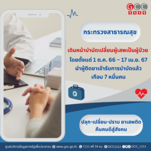 กระทรวงสาธารณสุข เดินหน้าบำบัดรักษาผู้ป่วยยาเสพติด 1.9 ล้านคน ตามนโยบาย 3 ป. ของรัฐบาล “ปลุกชุมชนให้เข้มแข็ง เปลี่ยนผู้เสพเป็นผู้ป่วย ปราบปรามสกัดกั้นยึดทรัพย์ผู้ค้า ขจัดข้าราชการทุจริตพัวพันยาเสพติดให้สิ้น”