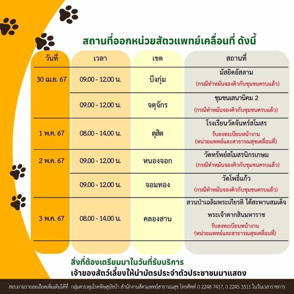สำนักอนามัย กรุงเทพมหานคร ชวนฉีดวัคซีนป้องกันโรคพิษสุนัขบ้า ฉีดไมโครชิปสุนัขและทำหมันสุนัขและแมว ฟรี วันที่ 30 เมษายน – 3 พฤษภาคม 2567 เจ้าของสุนัขและแมว ให้มาลงทะเบียน ภายใน 10.00 น.