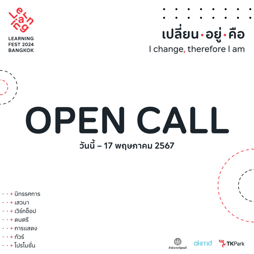 TK Park อุทยานการเรียนรู้ เชิญร่วมกิจกรรม Learning Fest Bangkok 2024 Open Call for Activities สมัครได้ตั้งแต่บัดนี้ – 17 พฤษภาคม 2567 เชิญมาร่วม “เปลี่ยน” สู่สิ่งที่ดีขึ้นไปด้วยกันได้ในรูปแบบหลากหลายไม่ว่าจะเป็นการจัดนิทรรศการ เวิร์กช็อป ทัวร์ ดนตรีและการแสดง โปรโมชั่น ภายใต้แนวคิด “เปลี่ยน.อยู่.คือ – I change, therefore I am” เปลี่ยนชีวิตเพื่อการเรียนรู้ เพราะการเรียนรู้เปลี่ยนชีวิต เพื่อทำให้เห็นว่าการเรียนรู้ที่เปี่ยมคุณภาพ คือการเปลี่ยนแปลงอย่างเป็นรูปธรรม นำไปสู่ชีวิตที่ดีขึ้น สังคมที่แข็งแกร่งขึ้น และเป็นการสานต่อเจตนารมณ์ของกรุงเทพมหานครในการเป็น “เมืองแห่งการเรียนรู้” อย่างยั่งยืน โดยสามารถเขียนรูปแบบเอกสารข้อเสนอโปรแกรม (Proposal) ของคุณเข้ามาได้ที่ https://bit.ly/LFCallForActivities ดาวน์โหลด PDF คู่มือการเข้าร่วมจัดเทศกาลฯ https://bit.ly/LFOpenCall24 อ่านรายละเอียดและสมัครเข้าร่วมจัดเทศกาลฯ ได้ที่ www.tkpark.or.th สอบถามข้อมูลเพิ่มเติมเกี่ยวกับการเข้าร่วมจัดเทศกาลฯ   อีเมล LFBKK2024@gmail.com โทร. 089-811-3788