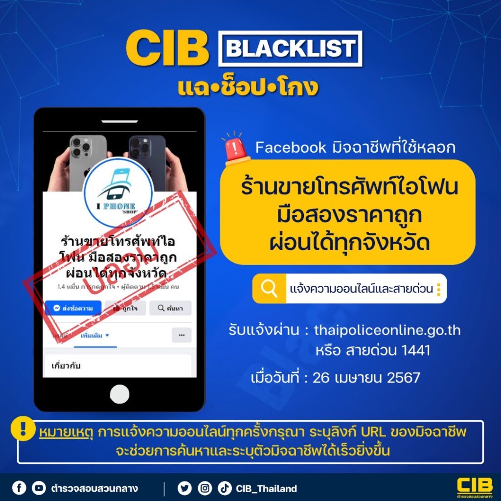 กองบัญชาการตำรวจสอบสวนกลาง แจ้งเตือนมิจฉาชีพเปิดเพจ Facebook : ร้านขายโทรศัพท์ไอโฟน มือสองราคาถูก ผ่อนได้ทุกจังหวัด เมื่อโอนเงินไปแล้ว ไม่สามารถติดต่อได้ เนื่องจากถูกบล็อกจากเพจ Facebook