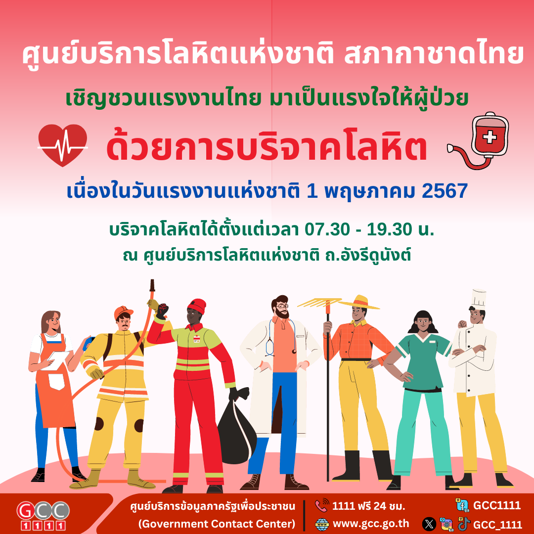 ศูนย์บริการโลหิตแห่งชาติ เชิญชวนแรงงานไทย มาเป็นแรงใจให้ผู้ป่วย ด้วยการบริจาคโลหิต วันที่ 1 พฤษภาคม 2567 ตั้งแต่เวลา 07.30 – 19.30 น. ณ ศูนย์บริการโลหิตแห่งชาติ ถ.อังรีดูนังต์