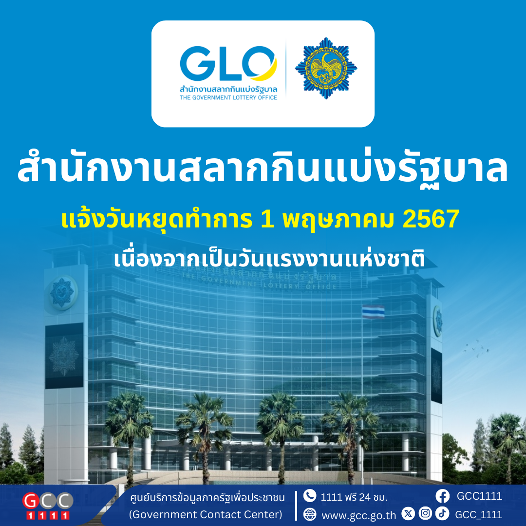 สำนักงานสลากกินแบ่งรัฐบาล แจ้งวันหยุดทำการ วันที่ 1 พฤษภาคม 2567 เนื่องจากเป็นวันแรงงานแห่งชาติ