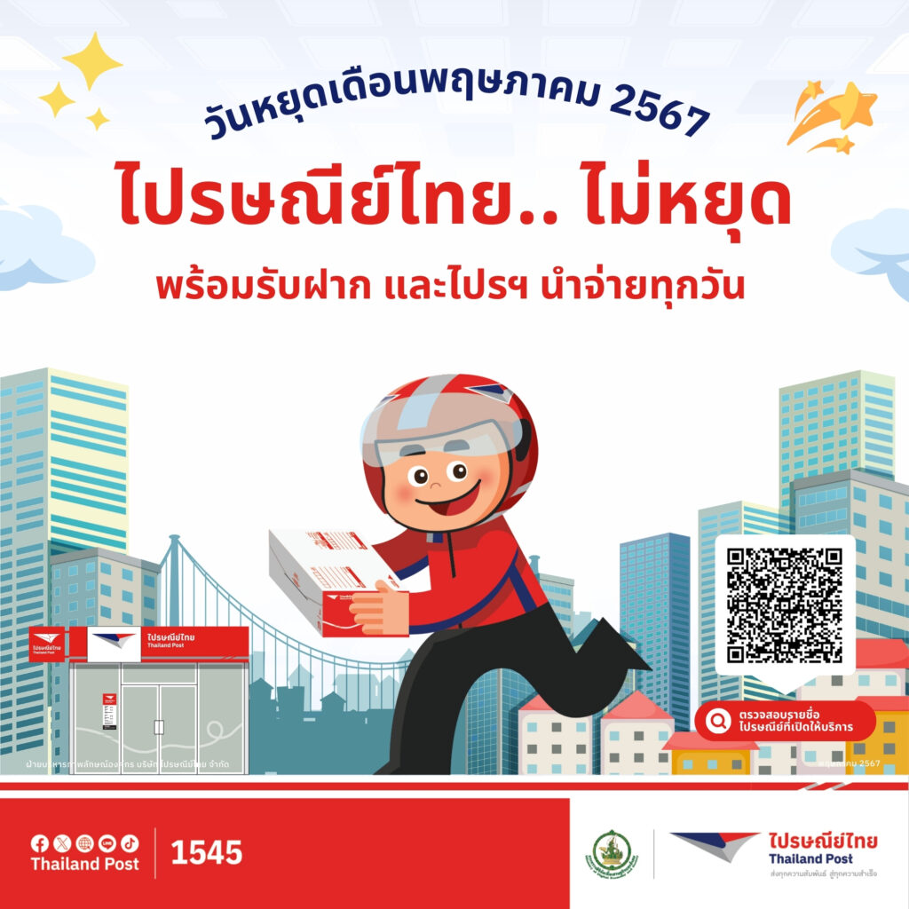 ไปรษณีย์ไทย แจ้งวันหยุดเดือนพฤษภาคม 2567 เปิดให้บริการตามปกติ ข่าวสารกิจกรรม ไปรษณีย์ไทย แจ้งวันหยุดเดือนพฤษภาคม 2567 เปิดให้บริการตามปกติ บริษัท ไปรษณีย์ไทย จำกัด แจ้งวันหยุดเดือนพฤษภาคม 2567 ไปรษณีย์ไทยเปิดให้บริการตามปกติผู้ใช้บริการสามารถตรวจสอบรายชื่อไปรษณีย์ที่เปิดให้บริการรับฝากได้ที่ QR Code หรือคลิก https://drive.google.com/…/1Nc8tofKNSKfXKXEPWHuEdBDpJ0p.. ค้นหา ปณ. ใกล้บ้านได้ที่ https://postbase.thailandpost.co.th/th/service-point เช็คสถานะพัสดุได้ที่ https://track.thailandpost.co.th/ ที่มา : https://shorturl.asia/tFIZr Post Views: 27 FacebookFacebookXTwitterLINELine