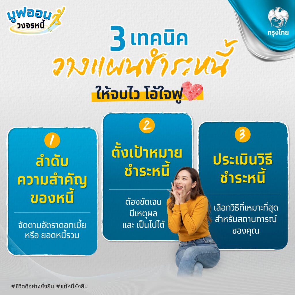 ธนาคารกรุงไทย จำกัด (มหาชน) แนะนำ 3 เทคนิค การวางแผนชำระหนี้ ดังนี้ จัดลำดับความสำคัญของหนี้ ตั้งเป้าหมายชำระหนี้ ที่มีเหตุผลและเป็นไปได้ และประเมินวิธีการชำระหนี้
