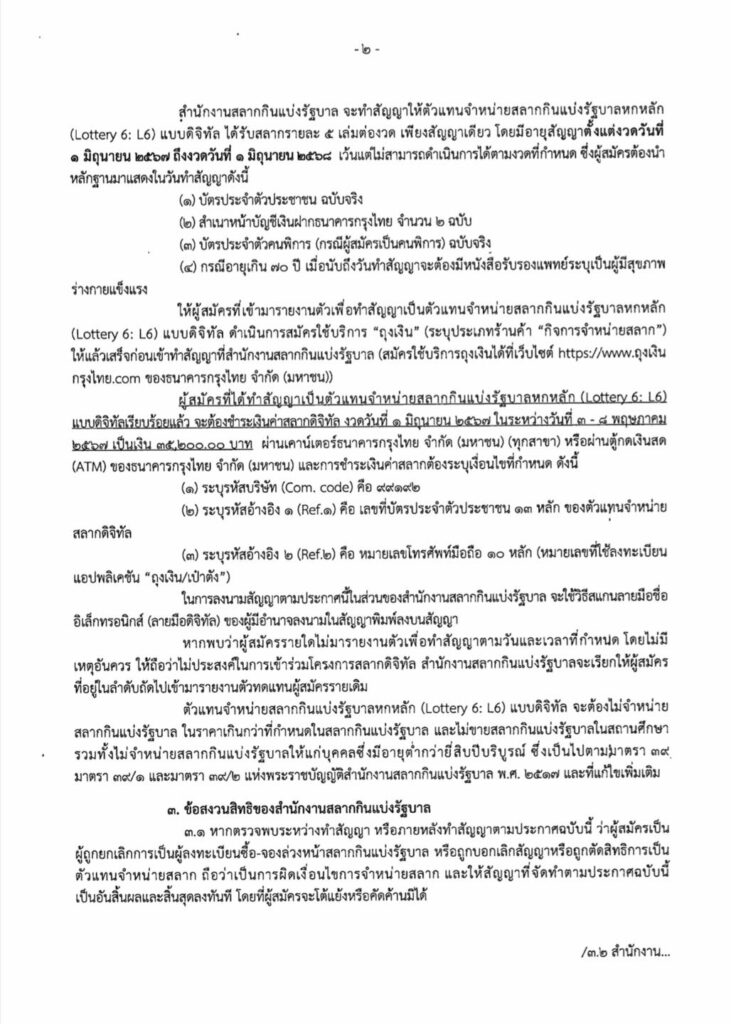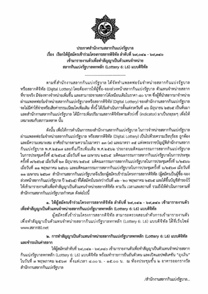 สำนักงานสลากกินแบ่งรัฐบาล เปิดเรียกผู้สมัครเข้าร่วมโครงการสลากดิจิทัล ลำดับที่ 69,041-69,340