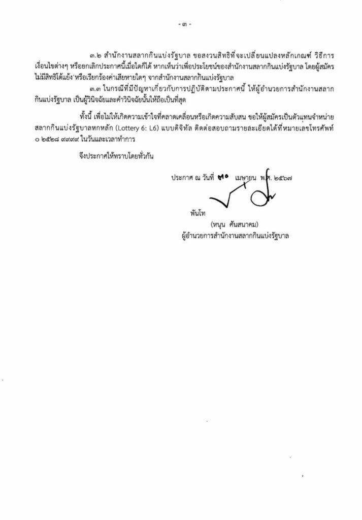 สำนักงานสลากกินแบ่งรัฐบาล เปิดเรียกผู้สมัครเข้าร่วมโครงการสลากดิจิทัล ลำดับที่ 69,041-69,340 เข้ามารายงานตัวเพื่อทำสัญญาเป็นตัวแทนจำหน่ายสลากกินแบ่งรัฐบาลหกหลัก (Lottery 6: L6) แบบดิจิทัล ในวันที่ 3 พฤษภาคม 2567 ณ ห้องประชุม ชั้น 2 อาคารออกรางวัล สำนักงานสลากกินแบ่งรัฐบาล ขอให้ผู้สมัคร ดำเนินการเปิดและลงทะเบียนแอปพลิเคชัน “เป๋าตัง” และ “ถุงเงิน” ให้เรียบร้อยก่อนเข้ามาทำสัญญา โดยติดต่อขอเปิด แอปพลิเคชัน “ถุงเงิน” “เป๋าตัง” ได้ที่ธนาคารกรุงไทย ทุกสาขา ได้ตั้งแต่บัดนี้เป็นต้นไป หรือสามารถดำเนินการเองได้ตามคู่มือ คู่มือการใช้งานแอปพลิเคชัน เป๋าตัง https://api.glo.or.th/…/0daec841-0f80-41ab-a6af… คู่มือการใช้งานแอปพลิเคชัน ถุงเงิน คลิกดูรายละเอียดทีนี่ https://api.glo.or.th/…/fad5934f-5f65-496c-a4c8… วิธีการเปิดถุงเงินและตรวจสอบความพร้อมก่อนทำสัญญาเป็นตัวแทนจำหน่ายสลากหกหลักแบบดิจิทัล https://api.glo.or.th/…/8a68c2c7-6394-4863-823a… สอบถามรายละเอียดได้ที่ ศูนย์ Call Center หมายเลขโทรศัพท์ 0 2528 9999 ในวันและเวลาทำการ