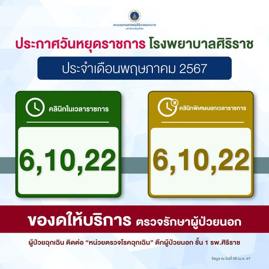 โรงพยาบาลศิริราช ประกาศวันหยุดราชการ ประจำเดือนพฤษภาคม 2567 วันที่ 6 ,10 เเละ 22 พฤษภาคม 2567 คลินิกในเวลาราชการ เเละ คลินิกพิเศษนอกเวลาราชการ งดให้บริการตรวจรักษาผู้ป่วยนอก ผู้ป่วยฉุกเฉิน ติดต่อ “หน่วยตรวจโรคฉุกเฉิน” ตึกผู้ป่วยนอก ชั้น 1 รพ.ศิริราช
