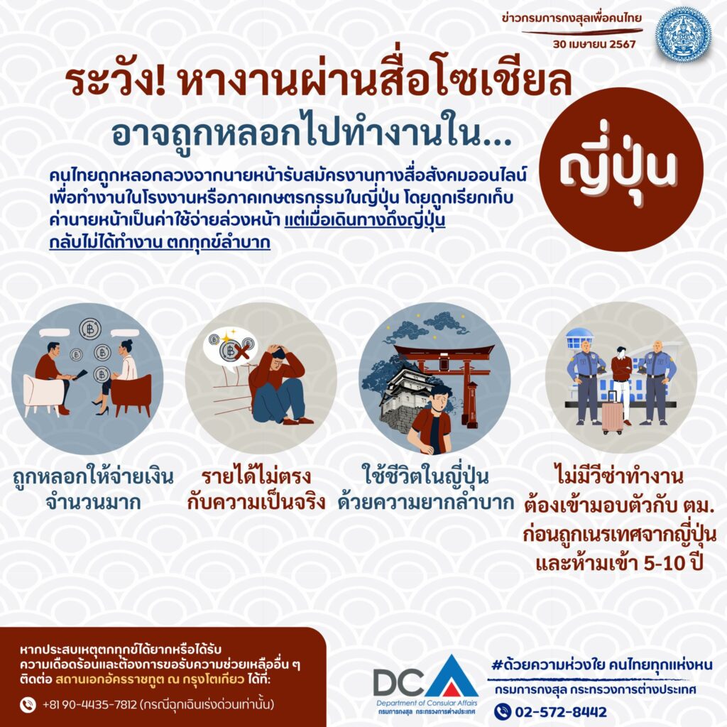 กรมการกงสุล เตือนคนไทย ระวังหางานผ่านสื่อโซเชียล อาจถูกหลอกไปทำงานในญี่ปุ่น