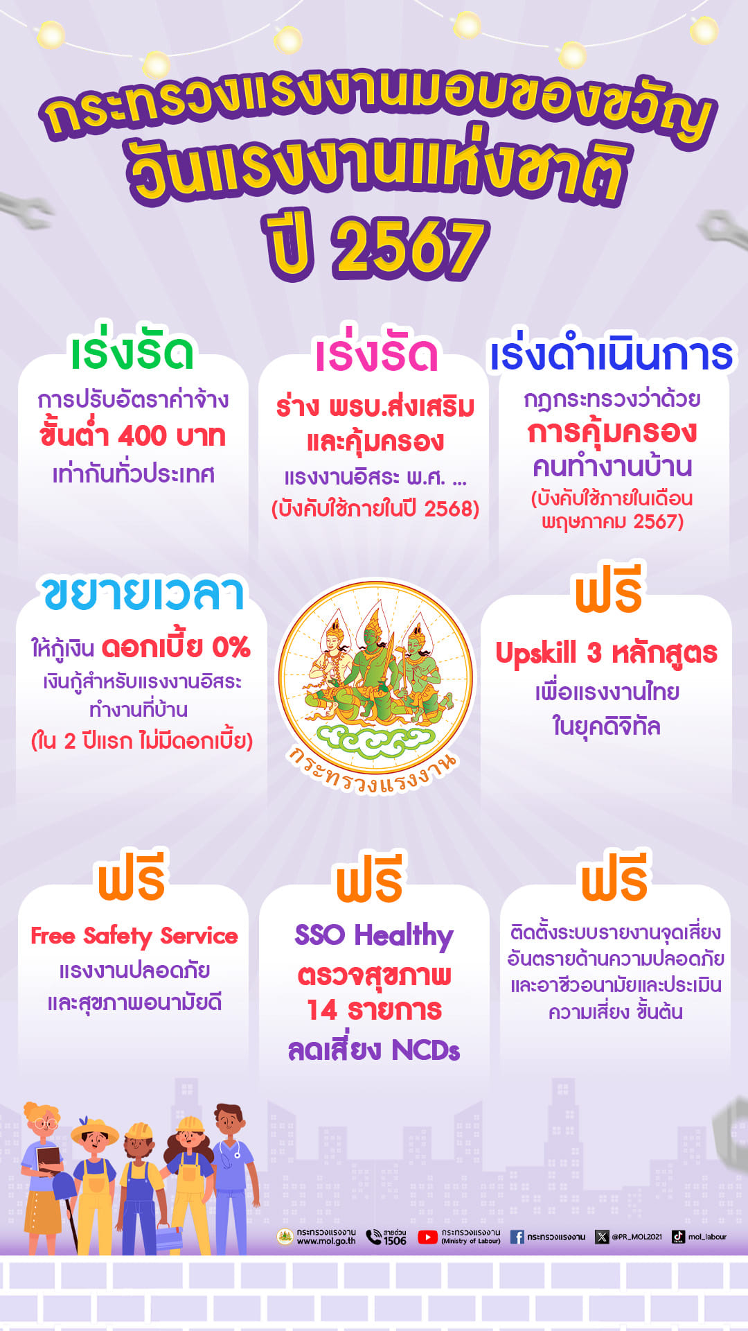 - กรมสวัสดิการและคุ้มครองแรงงาน มอบของขวัญ วันแรงงานแห่งชาติ ปี 2567 ดังนี้
