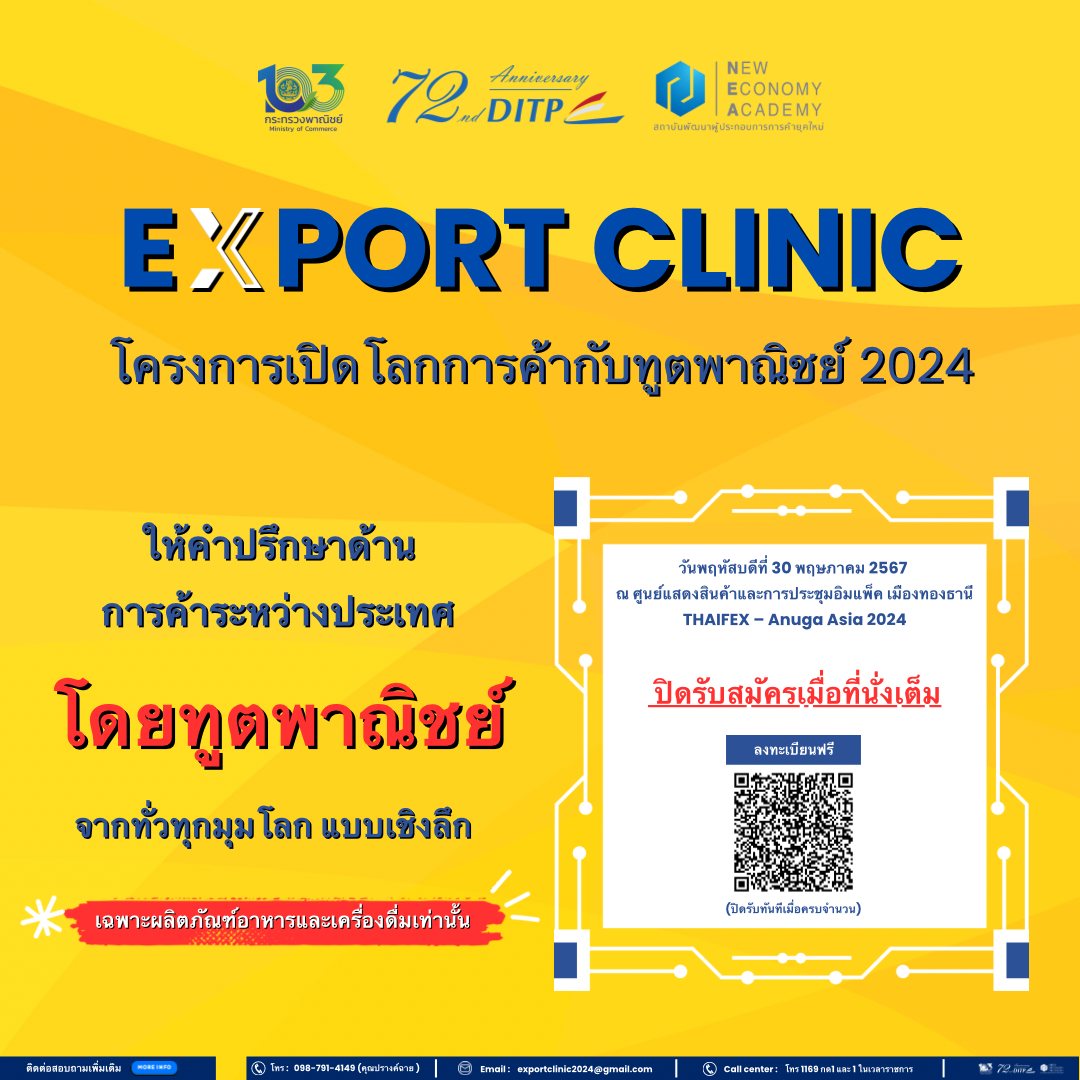 กรมส่งเสริมการค้าระหว่างประเทศ จัดโครงการเปิดโลกการค้ากับทูตพาณิชย์ (Export Clinic) ครั้งที่ 2 วันที่ 30 พฤษภาคม 2567 ณ ศูนย์แสดงสินค้าและการประชุมอิมแพ็คเมืองทองธานี ผู้ที่สนใจสามารถลงทะเบียนฟรีได้ที่ (ปิดรับสมัครเมื่อที่นั่งเต็ม) https://drive.ditp.go.th/หน้าหลัก/รายละเอียดกิจกรรม/activityid/14319