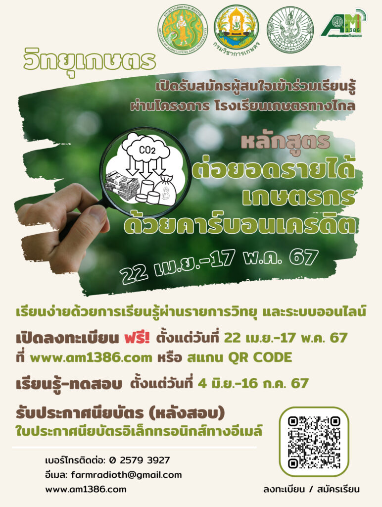 กรมส่งเสริมการเกษตร จัดกิจกรรมโรงเรียนเกษตรทางไกล หลักสูตร “ต่อยอดรายได้เกษตรกรด้วยคาร์บอนเครดิต” สมัครเรียนได้ตั้งแต่วันนี้ – 17 พฤษภาคม 2567